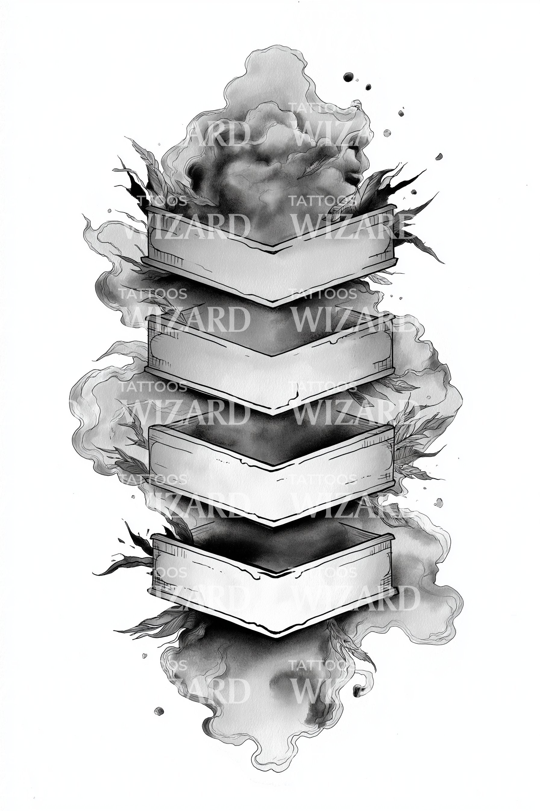 Ink-washed stack of floating books releases billows of smoke, each spine edged with delicate linework and drifting leaves. Pages suggest doors to knowledge and hidden magic, a mystic ascent through stories. Wearing it feels like carrying a portable library spell, grounding curiosity while inviting endless wonder.