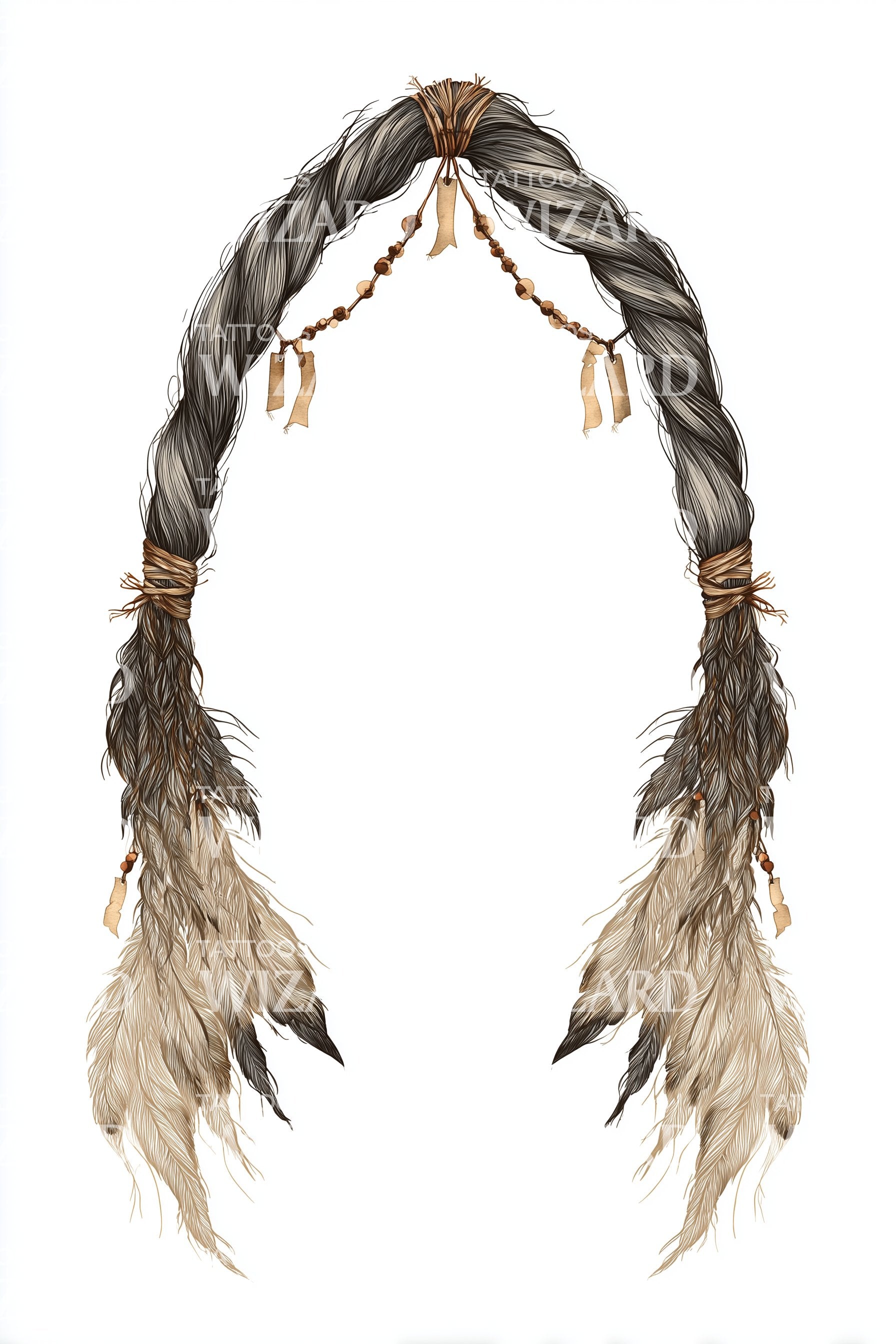 Braided rope forms an arcing crown, textured with weathered strands, wooden beads, and wind-soft feathers in earthy tones. This realism piece weaves strength and flexibility, unity and journey, into one boho talisman. Wearing it feels grounded yet wild, a quiet oath to resilience, roots, and graceful motion.