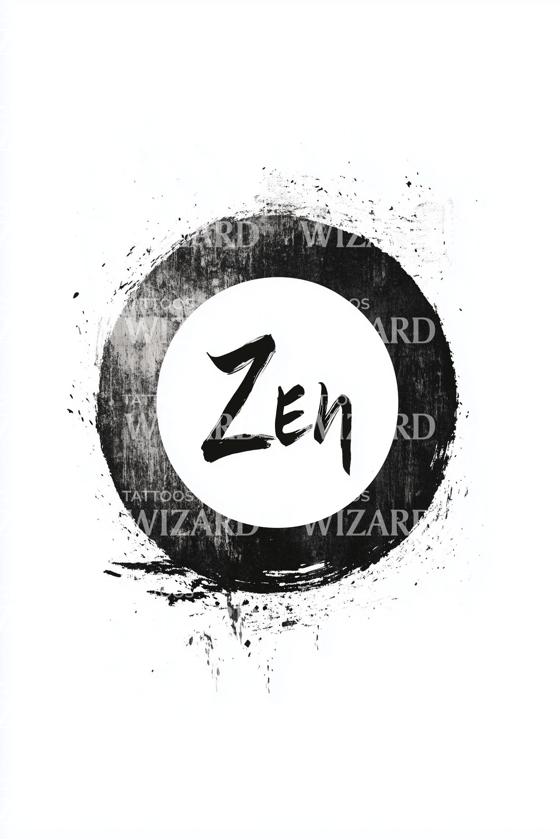 Bold ink circle, brushed with splatter, frames the word Zen in calm white space. The minimal enso symbolizes wholeness, presence, and imperfect perfection, inviting focus and breath. Wearer feels grounded, powerful. Ideal placements: shoulder cap for round flow, inner forearm for focus, sternum/heart for intention, upper back for balance.
