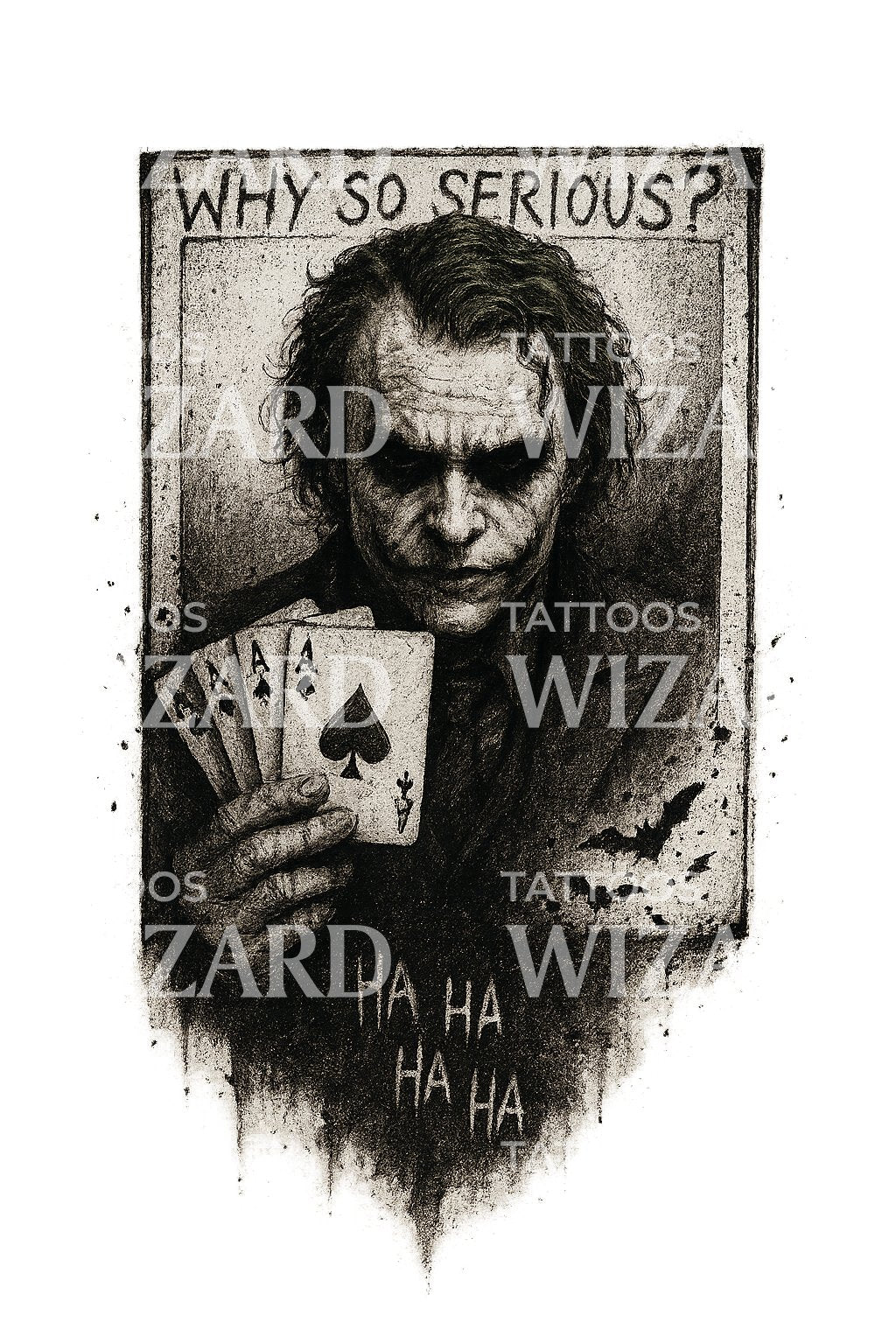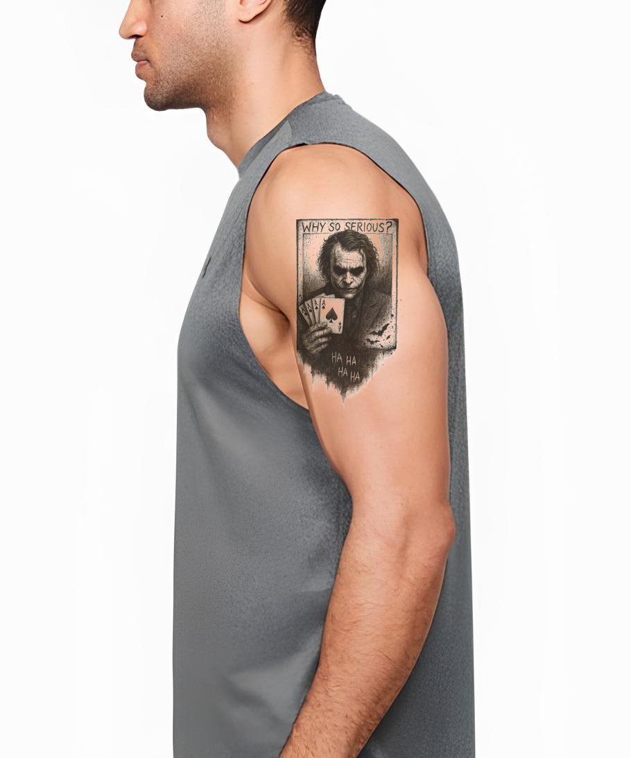 Immergiti nel mistero di questo disegno illustrativo di tatuaggio Joker. Unendo toni scuri di nero e grigio con elementi di estetica bruciata e grunge, questo pezzo cattura brillantemente l'essenza inquietante dell'era dei fumetti. Con simboli coinvolgenti di carte joker, aggiungerà sicuramente un tocco unico al tuo stile personale.
