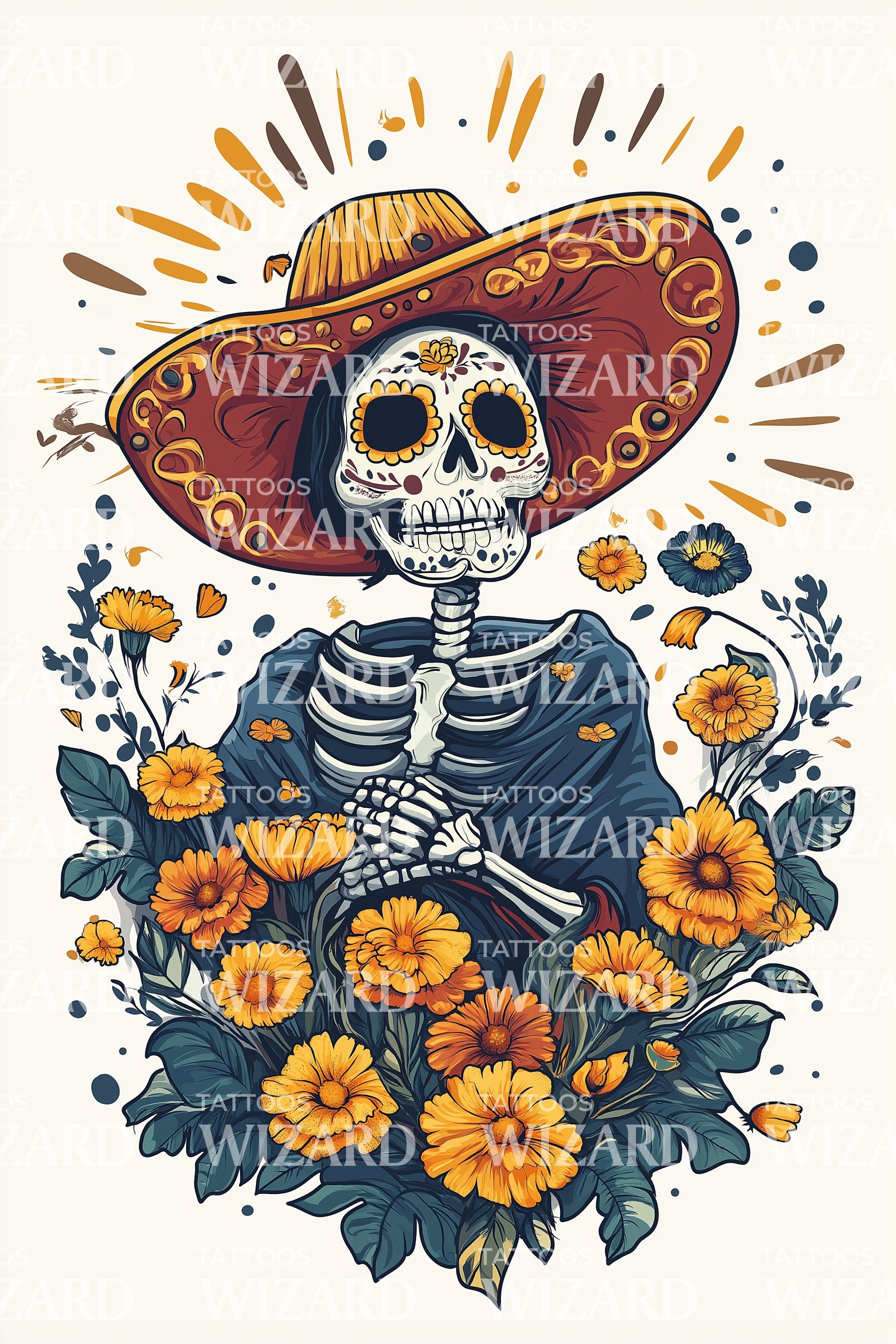 Immergiti nella ricca cultura messicana con questo unico disegno illustrativo per tatuaggi. Ispirato al vivace Festival dei Morti, presenta una calavera o scheletro splendidamente dettagliato, intrecciato con splendidi elementi di calendula. Questo design è perfetto per chi apprezza l'arte e il simbolismo del folklore messicano.
