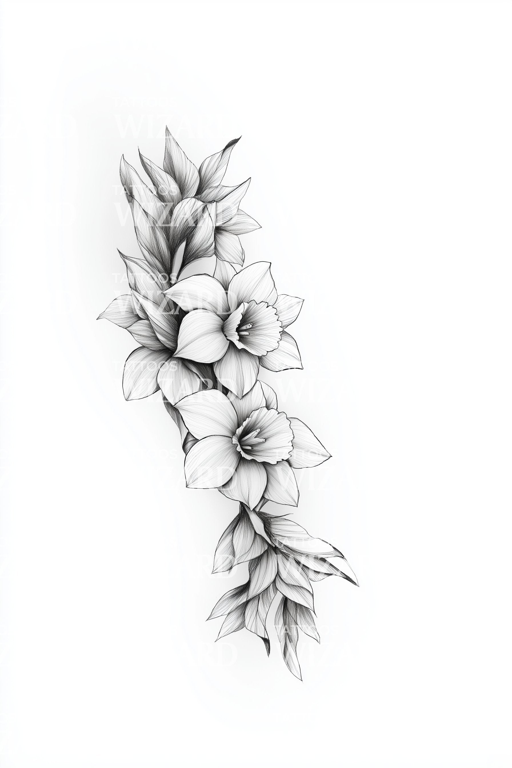 Vivi la sublime bellezza dell'arte botanica delicata con questo disegno di tatuaggio fineline. Mostra una cascata di fiori, finemente incisi e che si snodano in uno spettacolo ipnotico di precisione. Questo design intreccia forza e fragilità, rendendolo un pezzo di espressione personale affascinante e unico.