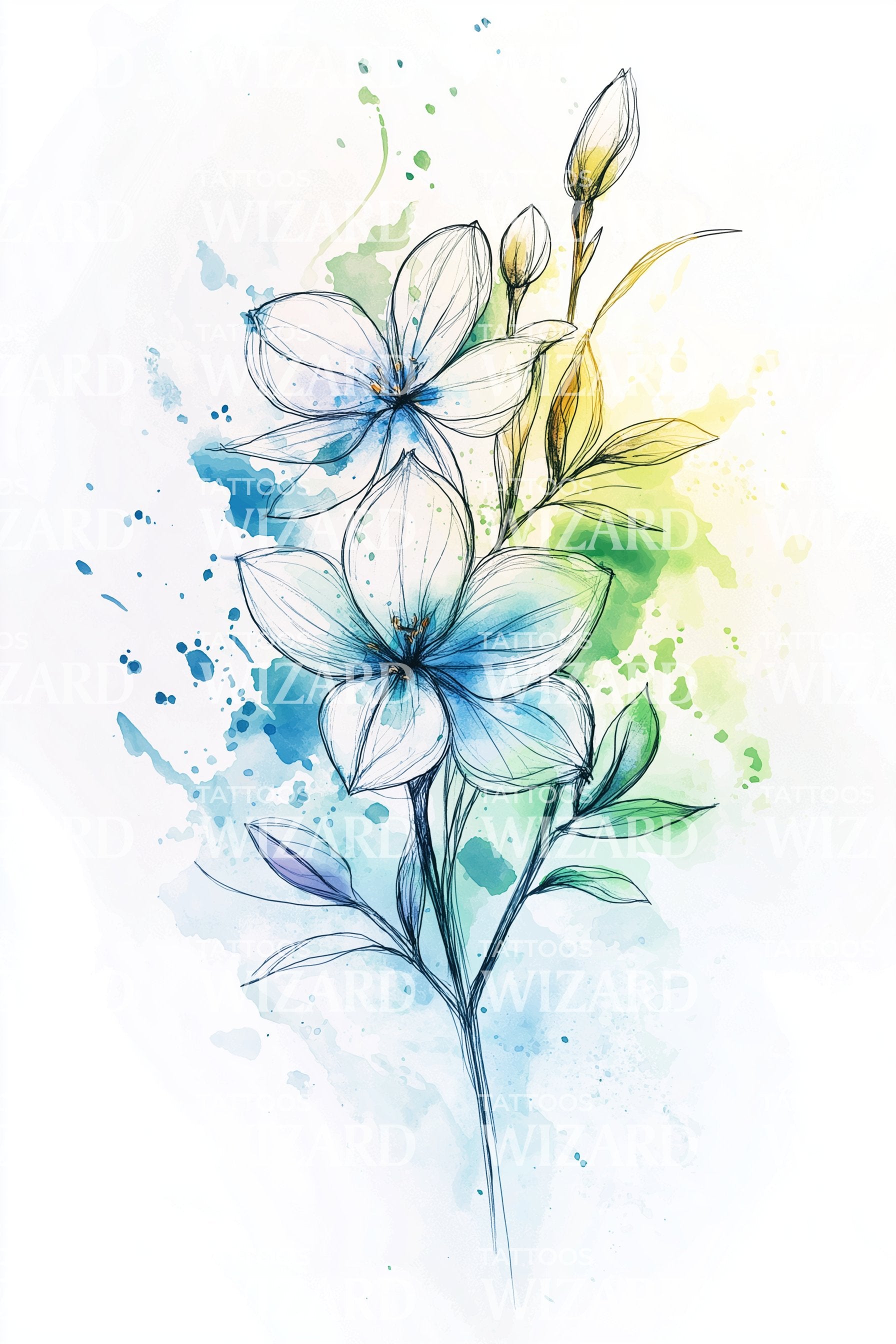 Vivi un'infusione vibrante di brillantezza cromatica con questo disegno di tatuaggio ad acquerello. Con un fiore in fiore elegantemente posato su un ramo, questo lavoro d'inchiostro mostra un'esplosione arcobaleno di tonalità, che riflette la bellezza effimera della vita. Non è solo un tatuaggio, è arte da indossare.