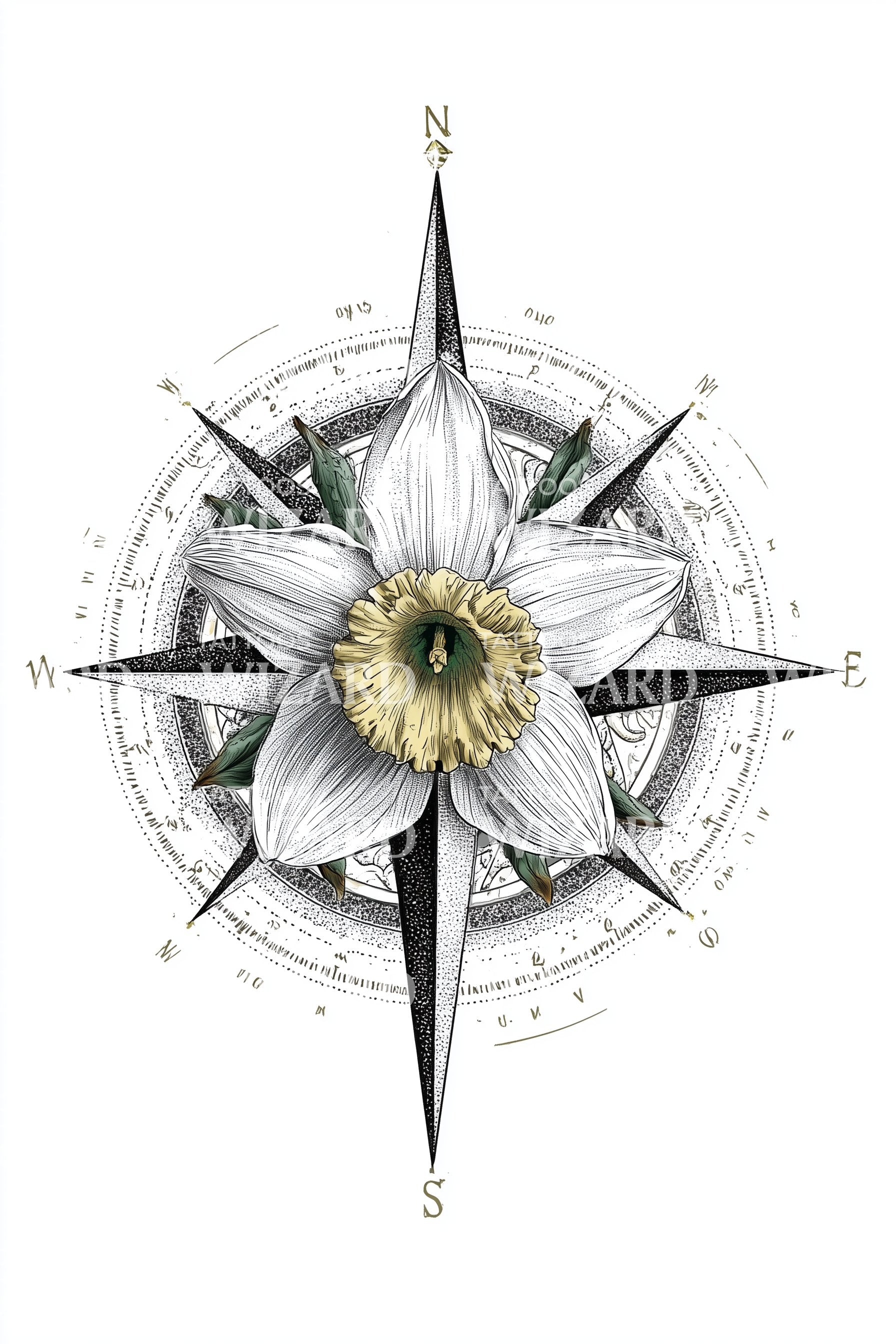 Questo disegno per tatuaggio incarna perfettamente la navigazione e la natura. Definito da linee geometriche nette, mette in risalto una bussola meticolosamente realizzata, delicatamente intrecciata con una magnolia in fiore. Questo design sorprendente unisce direzione e bellezza, incarnando sia la guida di una bussola sia l'eleganza di un fiore.