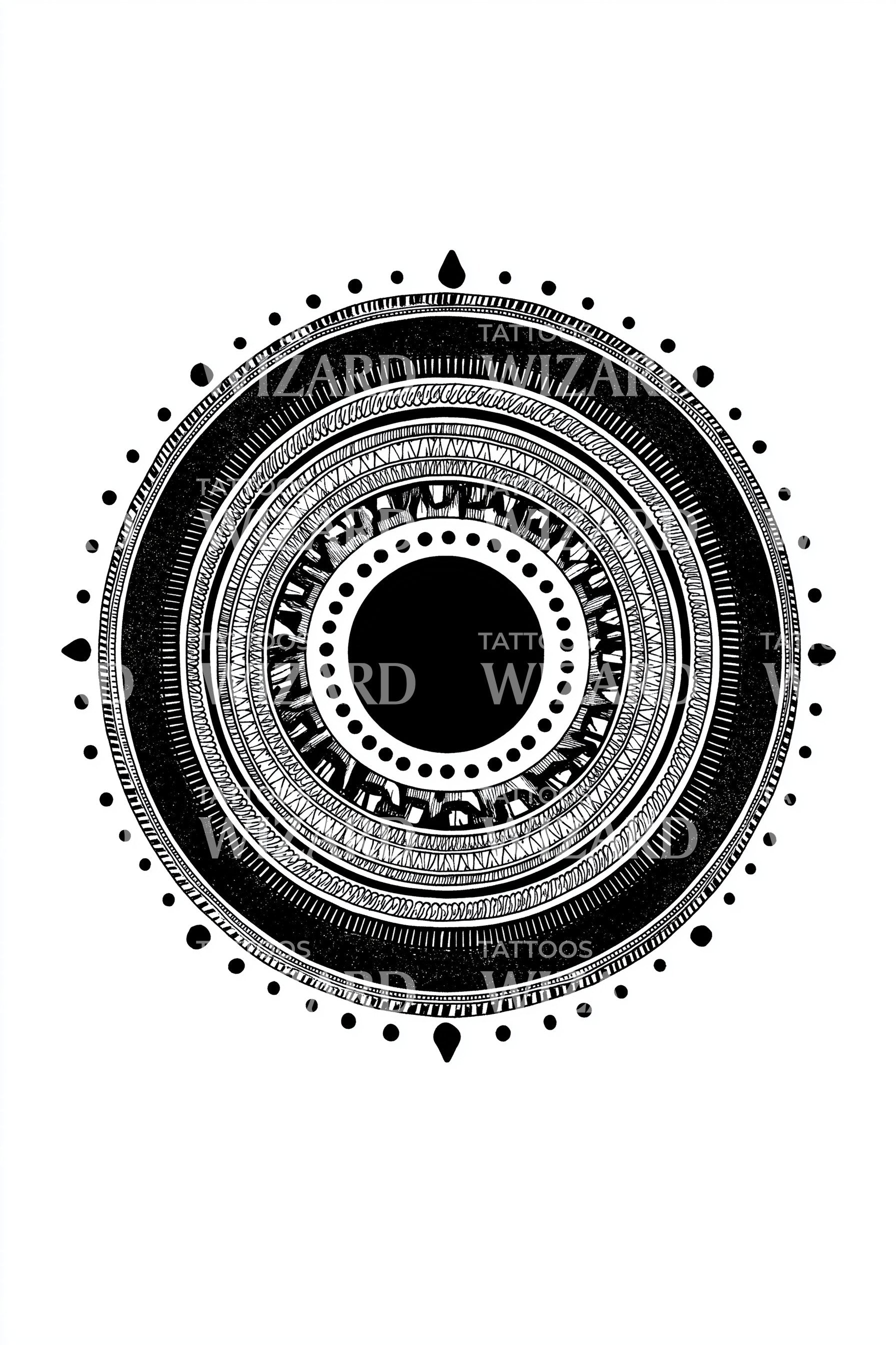 Adorna il tuo corpo con il nostro squisito disegno di tatuaggio mandala. Questo pezzo d'arte intricato presenta una serie di orbite concentriche, fondendo armoniosamente geometria e motivi mandala. Evidenziato da puntini che aggiungono profondità, il formato circolare incarna completezza, unità e connessione spirituale.