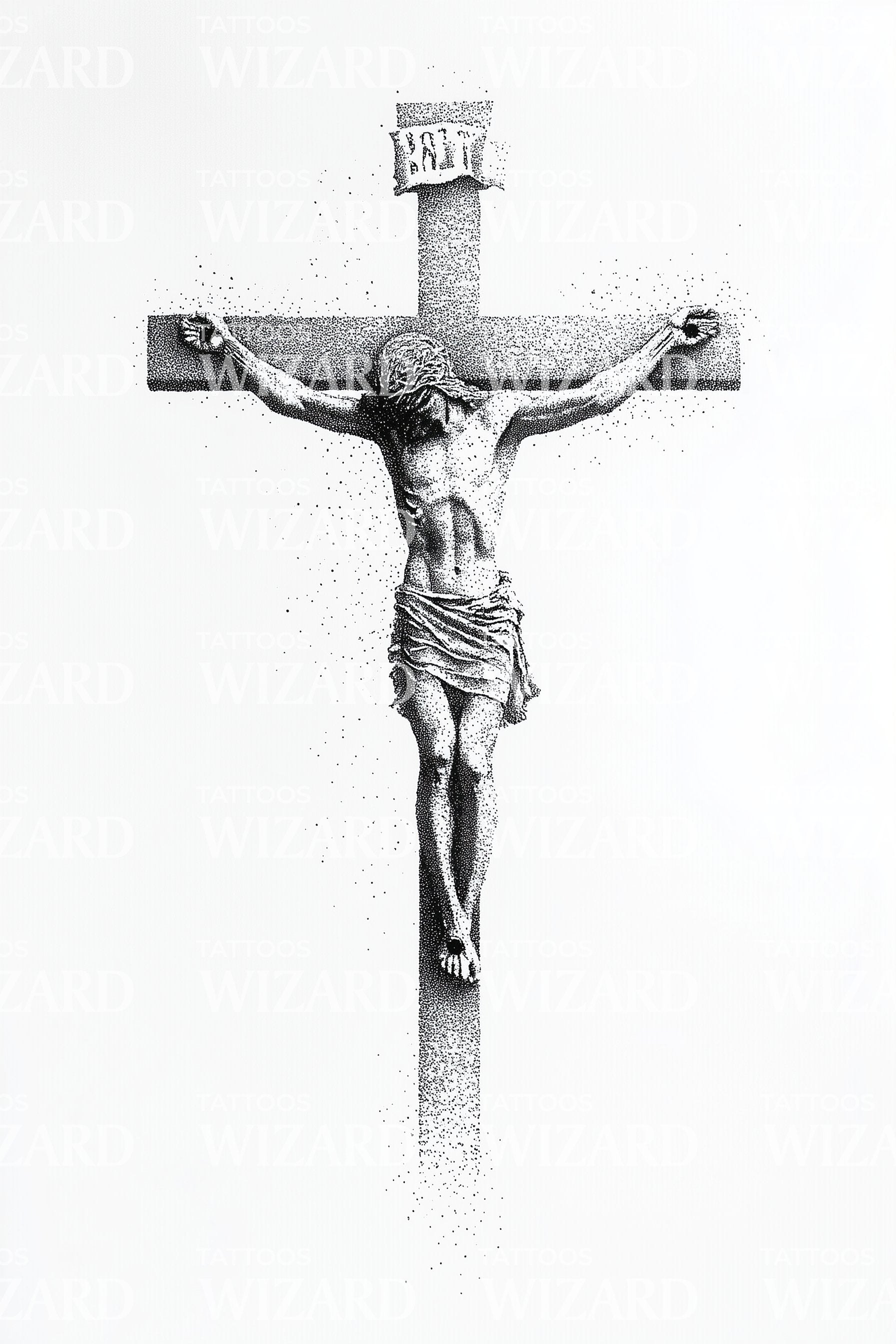 Svela la tua fede con questo classico disegno di tatuaggio a crocifisso in bianco e nero. Realizzato con la tecnica del dotwork, crea una figura visivamente sorprendente che esprime forza e devozione. La sua estetica senza tempo e l'atmosfera devota lo rendono un pezzo universalmente apprezzato sia dai credenti che dagli appassionati di tatuaggi.