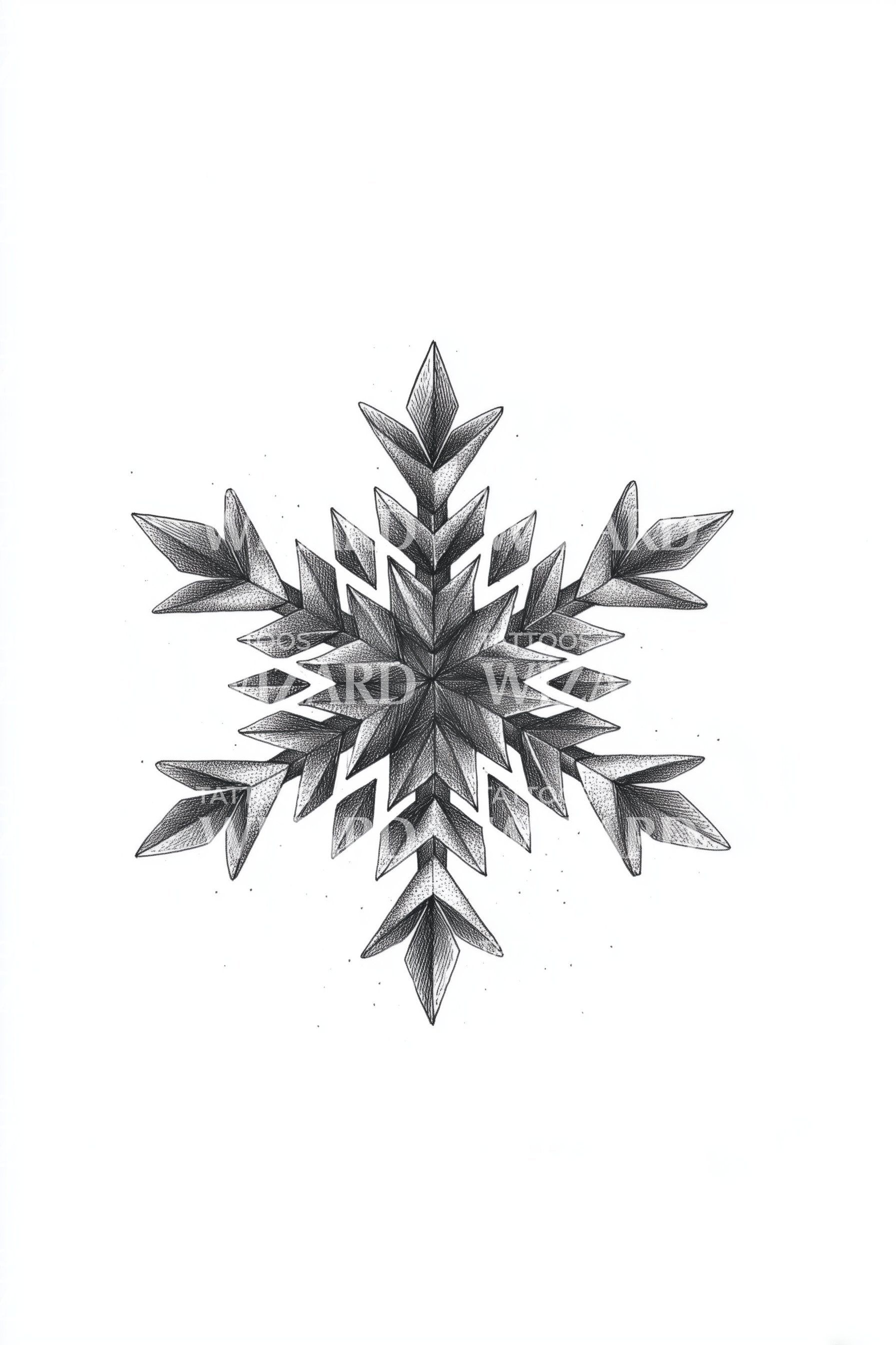 Frigid geometry blooms in crisp blackwork: a symmetrical snowflake carved from faceted crystal, each shard shaded with fine dotwork for icy depth. Symbol of uniqueness, resilience, and the clarity of winter silence. Worn on skin, it steadies breath, sharpening focus and radiating cool, unwavering calm and purpose.