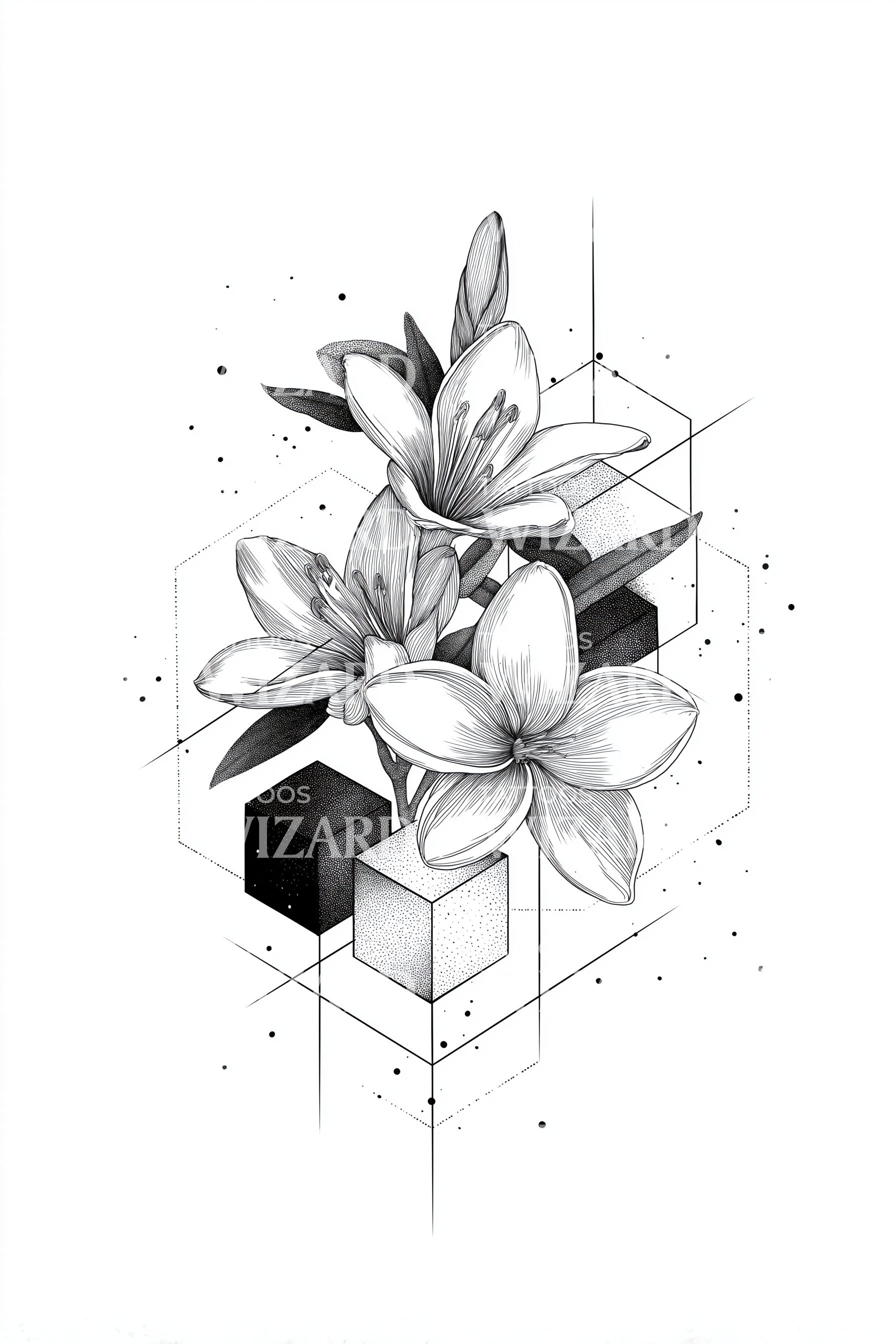 Emanando eleganza, questo disegno di tatuaggio floreale presenta un affascinante bouquet di fiori di magnolia racchiuso in un innovativo motivo geometrico cuboide. Progettato con cura, questo pezzo fonde la bellezza e la complessità della natura per chi cerca un'espressione unica di raffinatezza floreale. Ideale per gli appassionati di fiori e gli amanti dei disegni geometrici.