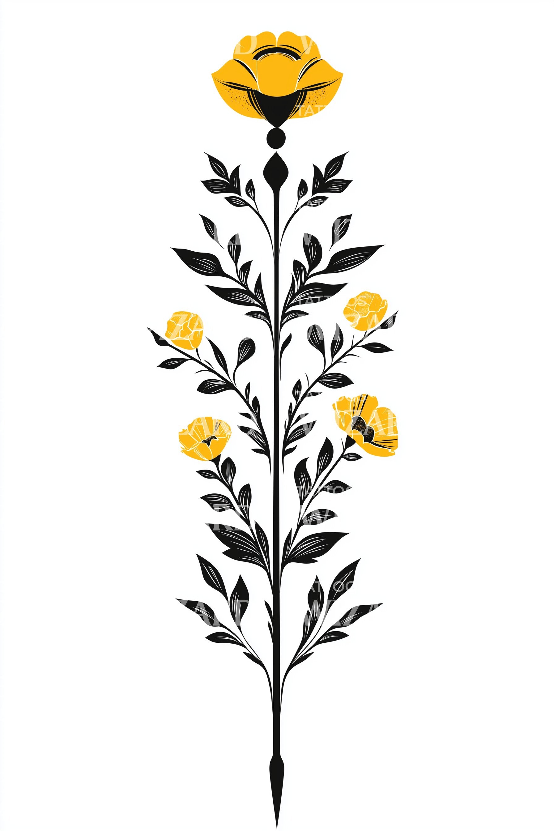 Questo disegno di tatuaggio con margherita dorata cattura perfettamente la bellezza botanica. Il suo stelo, riccamente dettagliato in stile illustrativo, si eleva fino a un capolavoro floreale, segnato da tonalità dorate che brillano di calore. Lasciati incantare dal fascino di questo pezzo coinvolgente che porta la meraviglia della natura sulla tua pelle.