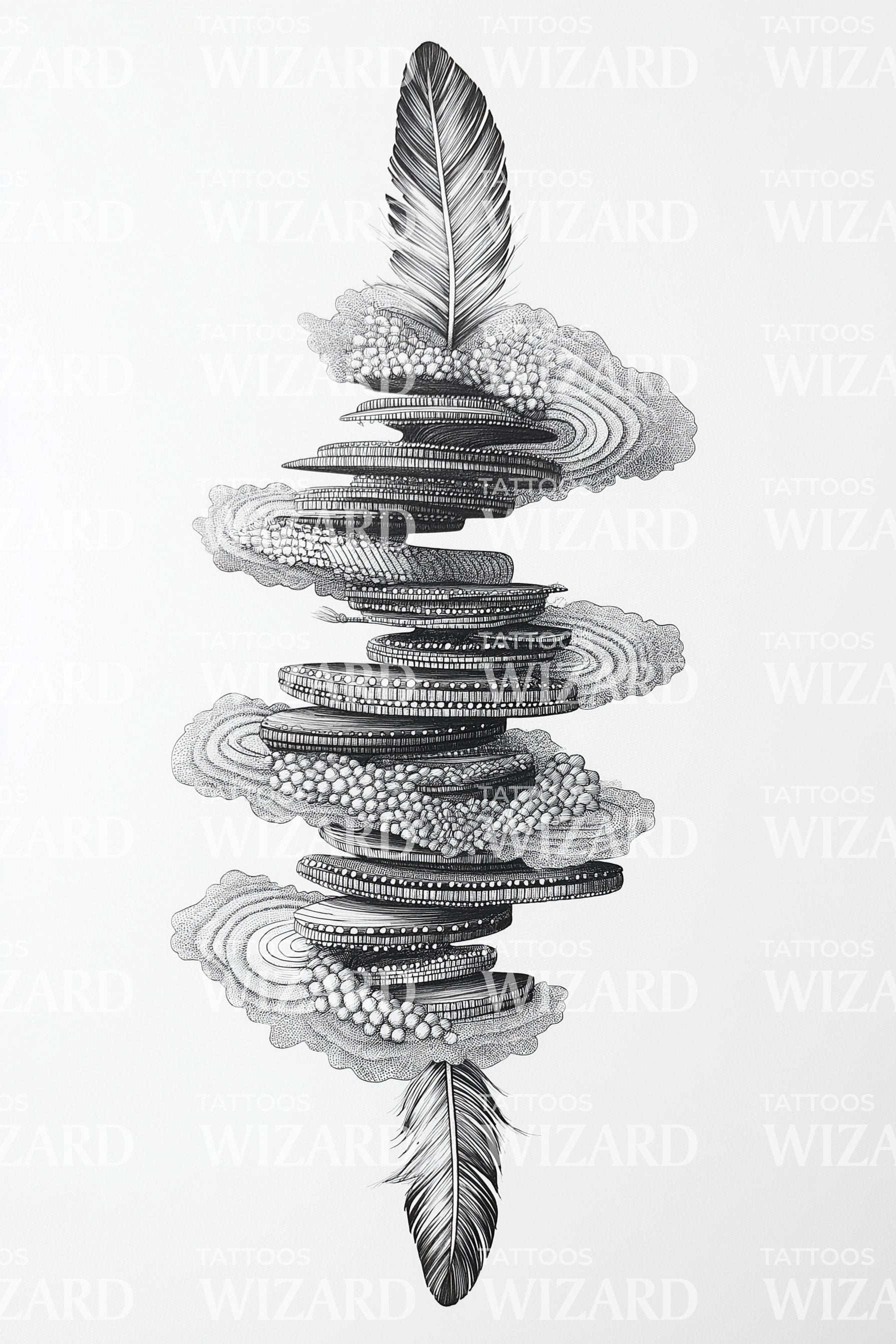 Stacked desert stones spiral in crisp black linework, crowned and anchored by delicate feathers. Fine stipple clouds carve a minimal landscape of wind and time, a totem of layered journeys. Symbol of balance, resilience, and lightness in motion, this sketch whispers calm confidence to the wandering heart.