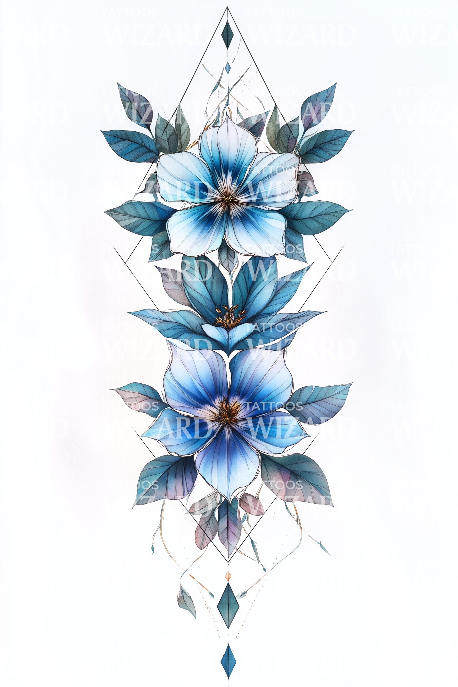 Questo disegno di tatuaggio ad acquerello intreccia magistralmente un bouquet di fiori blu con motivi geometrici a diamante. Combina la morbidezza dei fiori con la grinta delle forme geometriche, creando un pezzo vibrante e affascinante. Perfetto per gli amanti dell'arte che cercano un'espressione floreale unica con un tocco moderno e astratto.