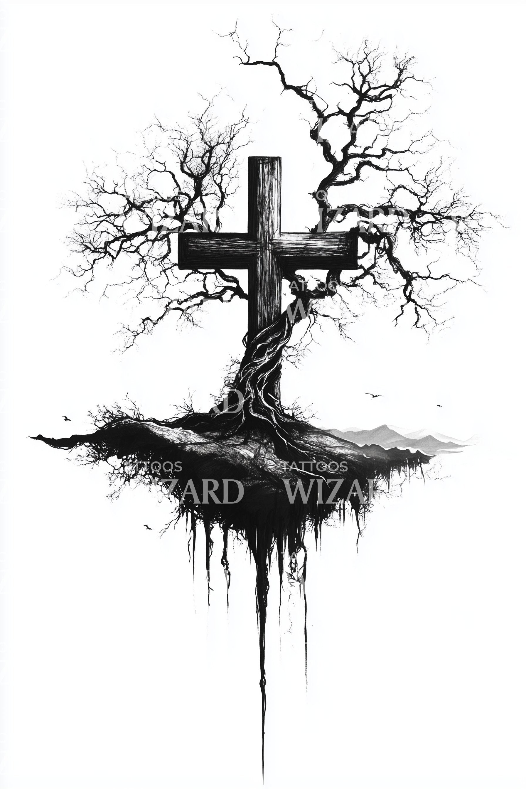 Libera il tuo lato spirituale con questo disegno di tatuaggio blackwork. Presenta una fusione grintosa di una croce che si trasforma in un albero, adornata da un effetto unico di gocce. Questo pezzo emana un fascino grezzo e misterioso, esprimendo sottilmente la tua fede. Distinguiti con questa visione d'inchiostro distintiva.