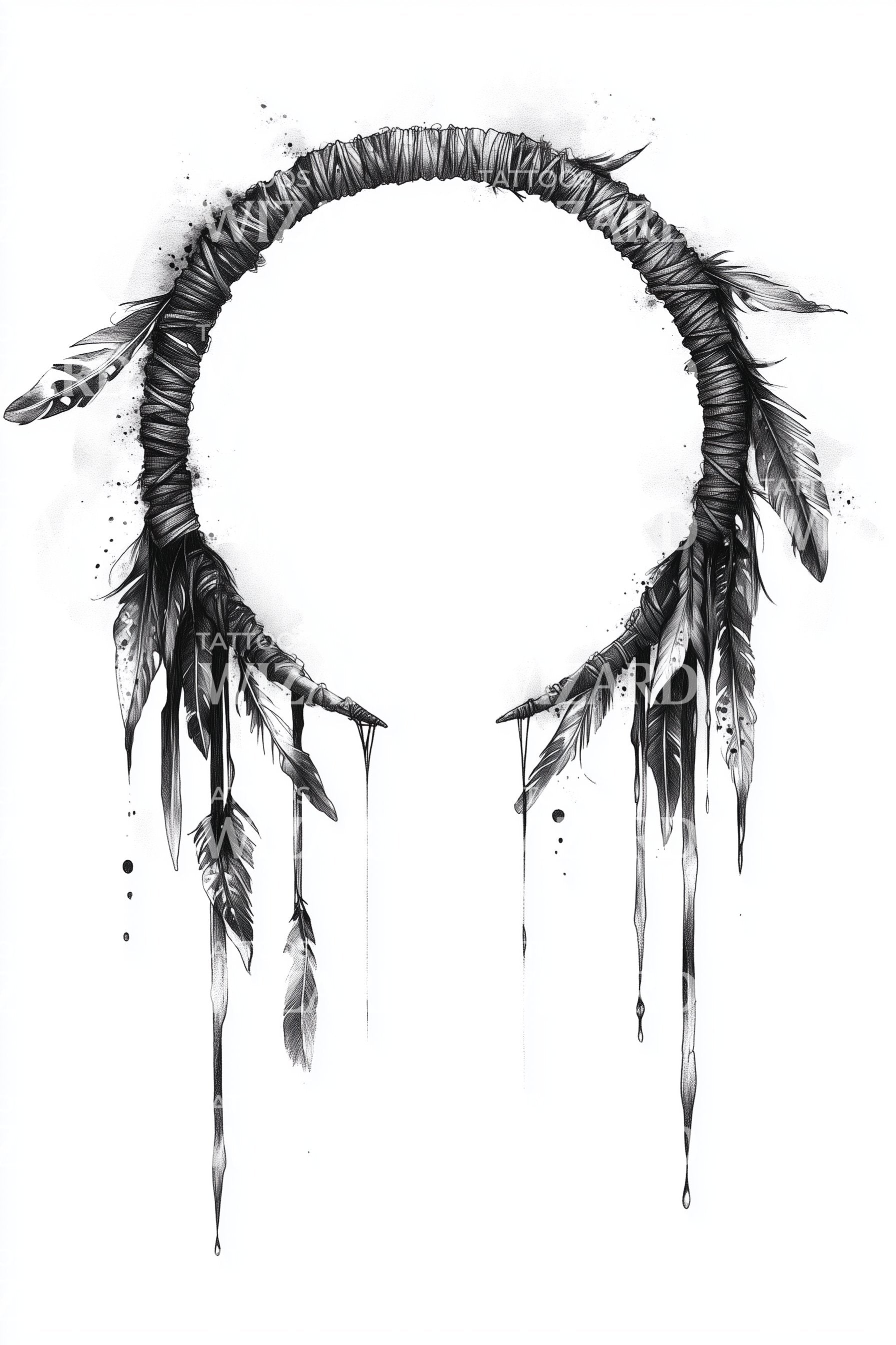 Blackwork wreath of bound feathers forms a hollow circle, ink dark and gently dripping, with soft splatter and stark texture. A halo of scars and flight, it honors protection, memory, and rebirth. Wearing it feels like quiet armor, a ritual mark of resilience and rising through shadowed skies.
