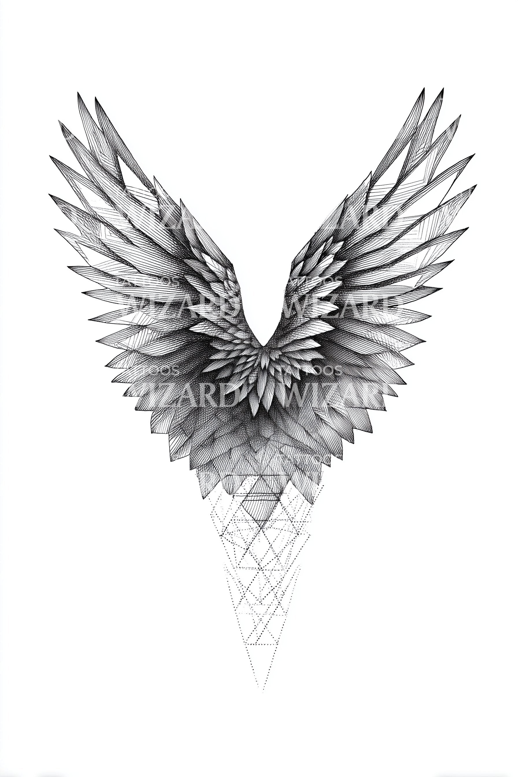 Cathedral-wing geometry unfolds in meticulous blackwork: layered feathered lattices rise from a fading triangular grid, sharp, luminous, purposeful. Symbolizing freedom earned through structure, each line remembers restraint while reaching skyward. Wearer feels uplifted, centered, and brave, carrying abstract flight on the spine of intention. A vow to ascend.