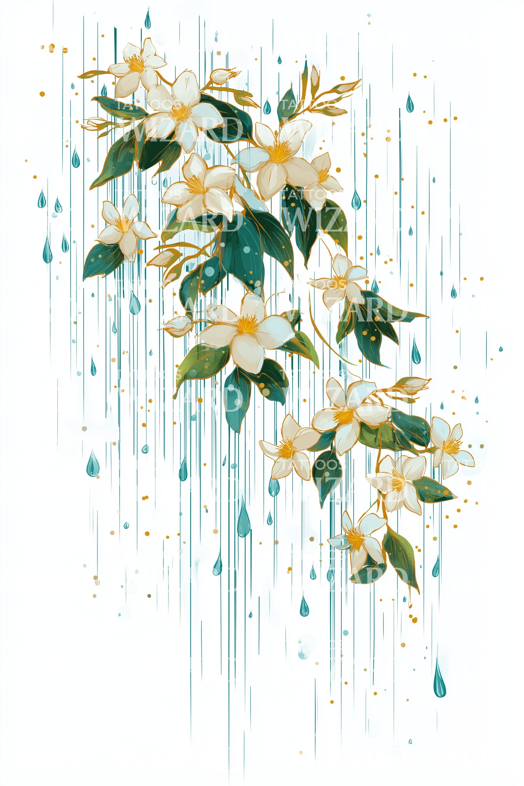 Immergiti nella bellezza di questo disegno di tatuaggio ispirato alla botanica. Combina perfettamente elementi floreali con tonalità dorate e schizzi ad acquerello, creando un'opera astratta ma affascinante. Questo disegno di tatuaggio floreale dorato aggiunge un tocco sofisticato alla tua personalità, evidenziando il tuo amore per la natura.