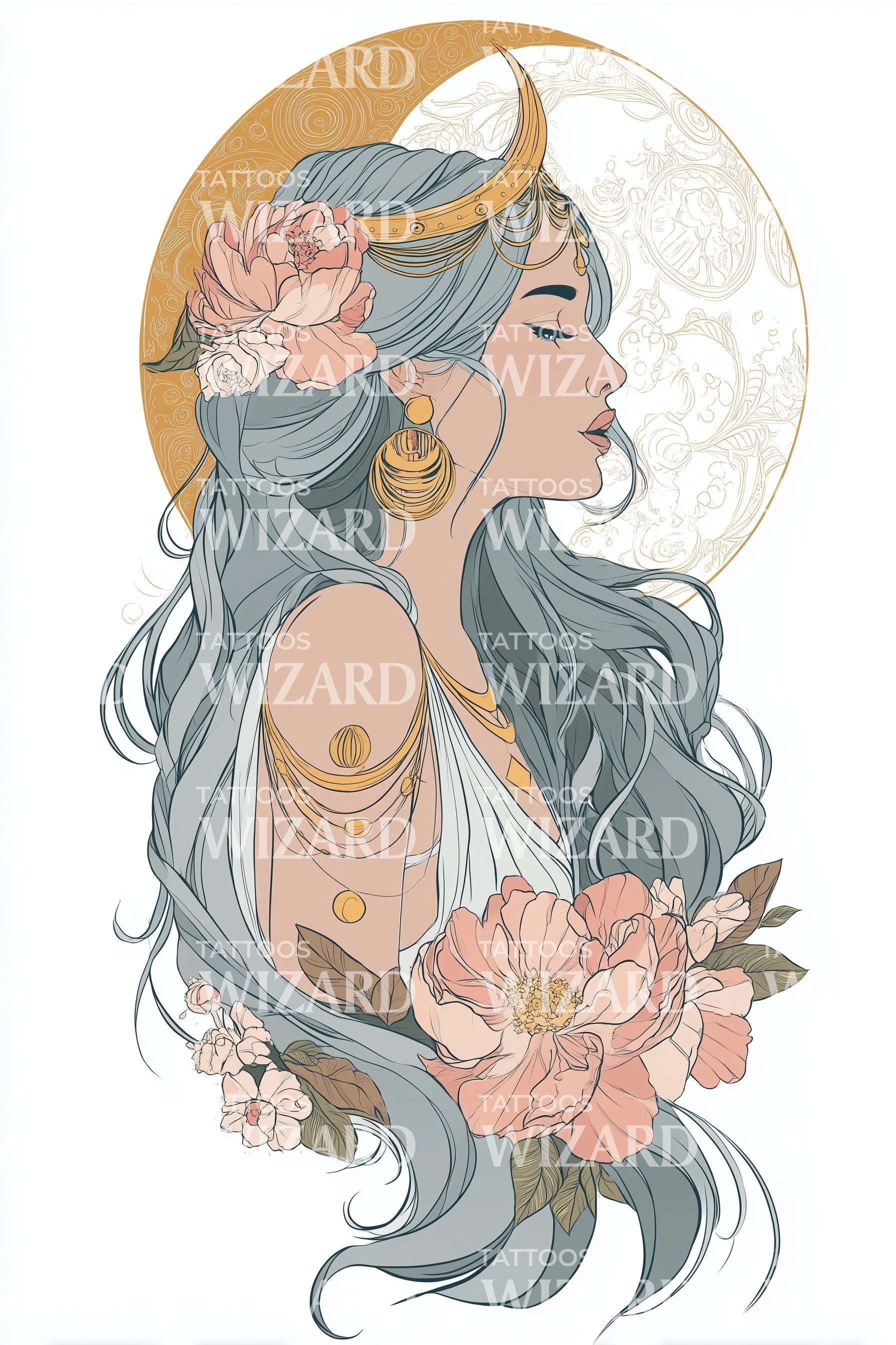 Abbraccia la tua arte con questo straordinario Design di Tatuaggio Musa Neo-Tradizionale. Ispirato all'estetica Art Nouveau, presenta un ritratto dorato splendente avvolto in un'aureola radiante. Questo pezzo trasforma la musa divina in un magnifico capolavoro di arte sulla pelle, offrendo un sublime incontro tra tradizione e innovazione.