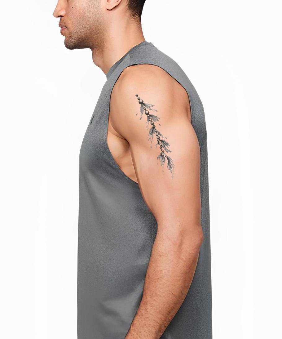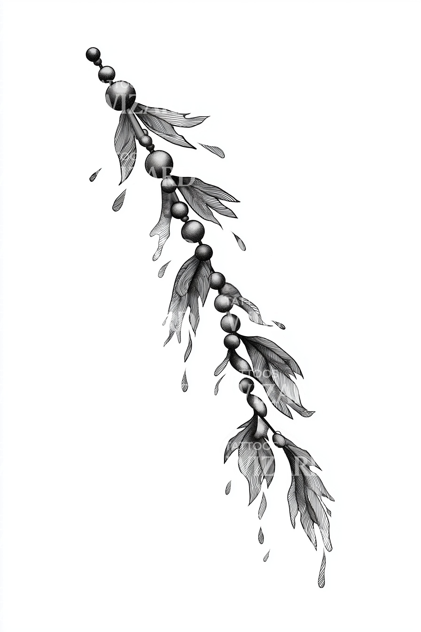 Fineline botanical sprig drapes in cascading leaves and bead-like berries, rendered in delicate dotwork and airy negative space. This herb-inspired branch symbolizes grounding rituals, renewal, and quiet protection. Wearing it feels like carrying morning dew on skin, a gentle reminder to move softly with organic nature each day.