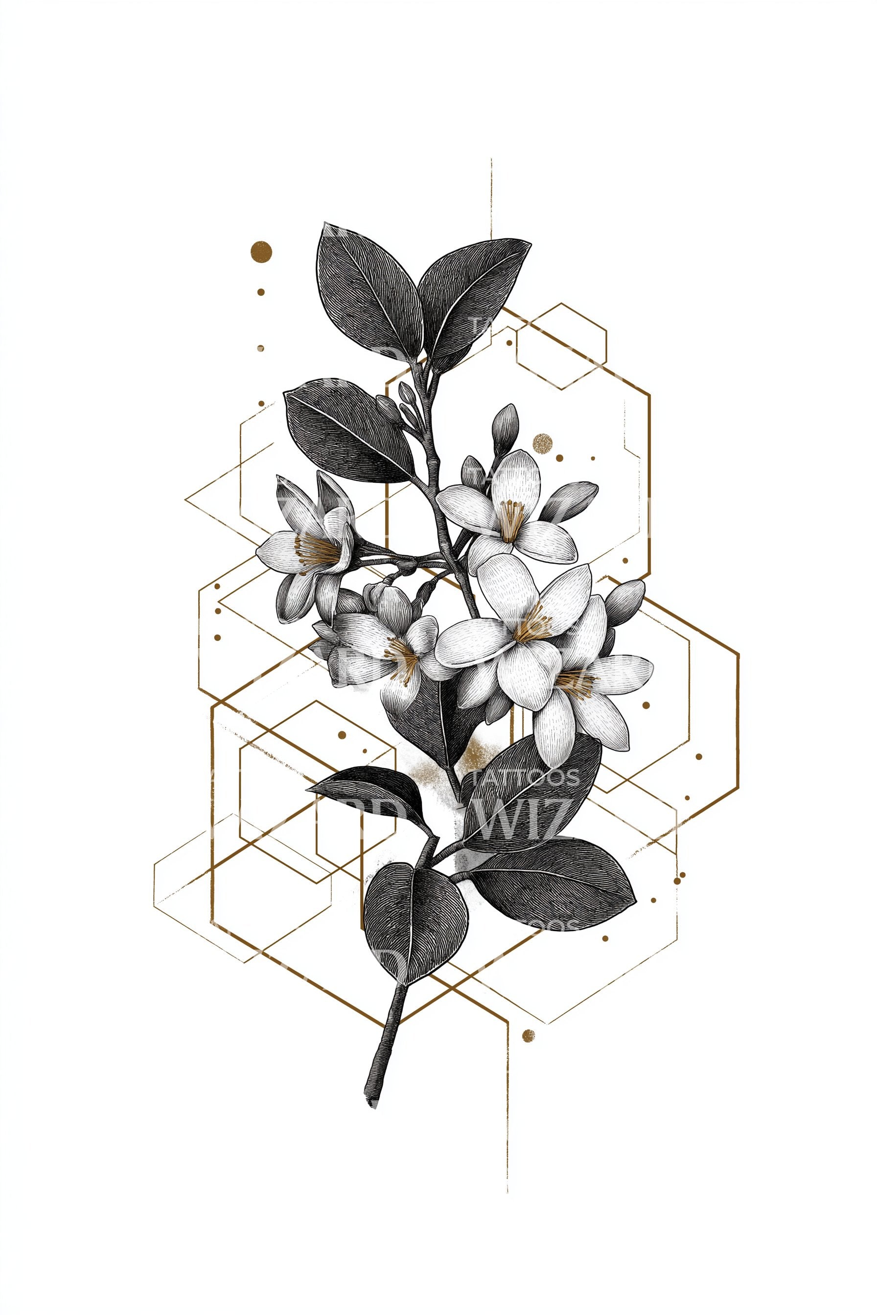 Immergiti nello splendore di questo disegno di tatuaggio fineline! Una fusione intricata di una magnolia in fiore e un dettagliato motivo a nido d'ape, intrecciati con ricche geometrie dorate. Questo tatuaggio illustra l'elegante contrasto tra la bellezza organica della natura e la precisione dei motivi geometrici.