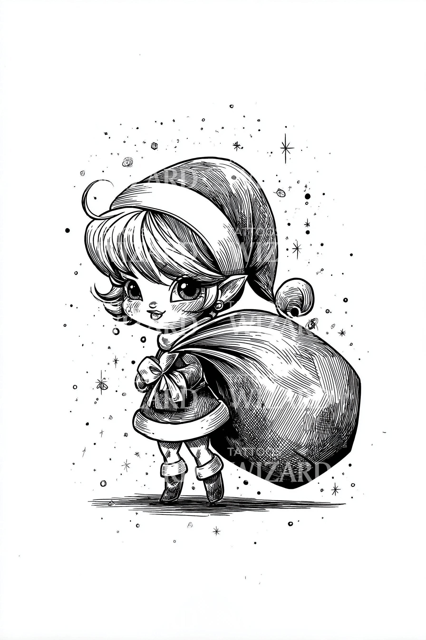 Black&grey linework frames a cute hooded girl, ribboned, hauling a sack through a scatter of stars. The hood shelters quiet courage; the sack carries wishes and stories, constellations mapping possibility. Wearing it feels protective and playful, a reminder to keep wonder close and meet life with whimsy.