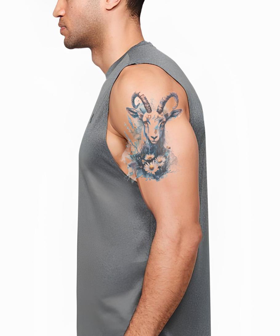 Libera il tuo spirito avventuroso con questo vivace design di tatuaggio ad acquerello! Rappresentando un possente stambecco contro uno splendido sfondo montano, è intrecciato con affascinanti accenti floreali. Questo tributo vivace e colorato alla bellezza della natura offre un ritratto artistico del tuo amore per gli animali e per la vita all'aria aperta.