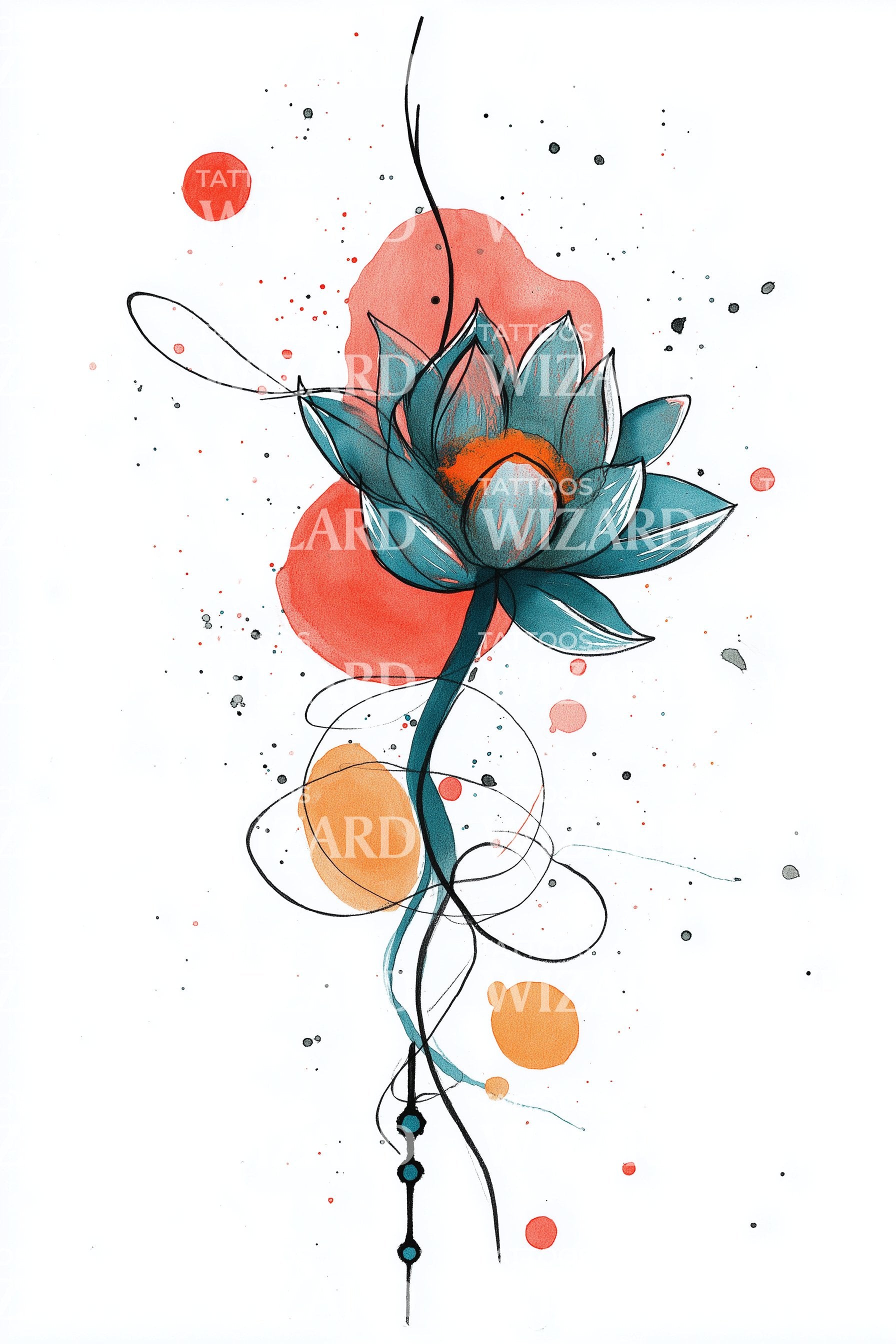 Abbraccia il tuo stile unico con questo design di tatuaggio a loto astratto. Realizzato in vivaci acquerelli, l'effetto splash moderno dona un tocco di sofisticazione e colore a questo antico simbolo. Ideale per chi cerca una rivisitazione contemporanea di un'iconica immagine spirituale.
