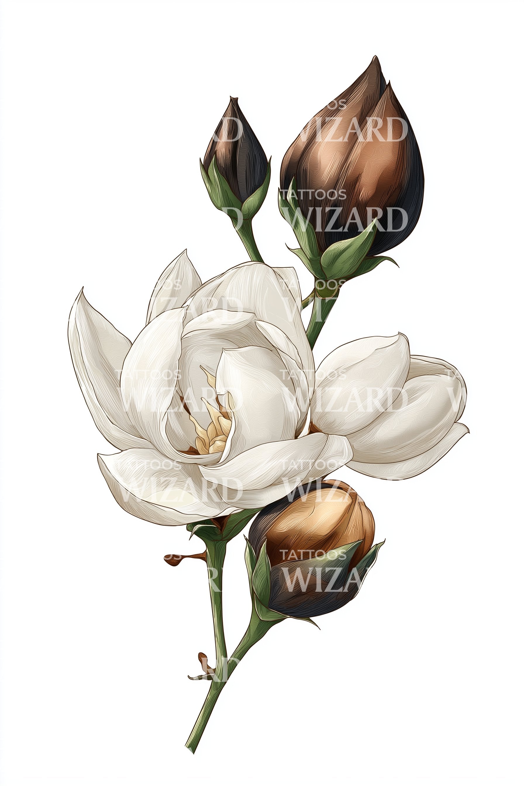 Immergiti nell'incantevole eleganza di questo disegno di tatuaggio realistico. Racchiude la sublime bellezza di una magnolia avorio in piena fioritura. I delicati dettagli floreali sono stratificati con realismo per creare un'esperienza visiva affascinante. Questo tatuaggio è più di un semplice inchiostro, è una dichiarazione di eleganza.