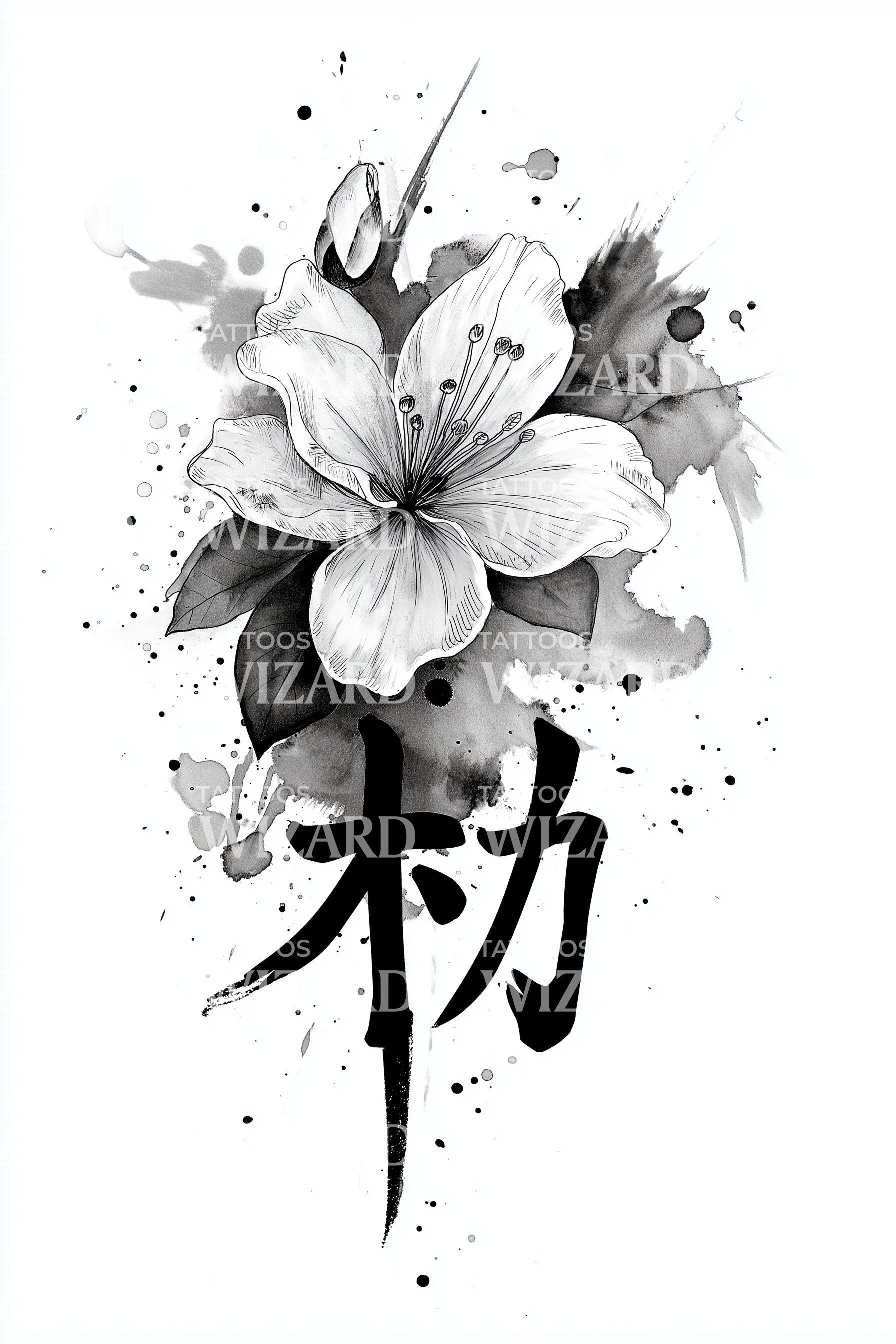 Scopri la tua armonia interiore con questo tatuaggio monocromatico ispirato all'Oriente. Presenta un fiore di Gelsomino nero e grigio splendidamente dettagliato, combinato con un profondo simbolo Kanji, che incarna l'essenza dell'Est. Questo design di inchiostro è la scelta perfetta per gli amanti dell'arte corporea intricata, simbolica e della narrazione visiva.