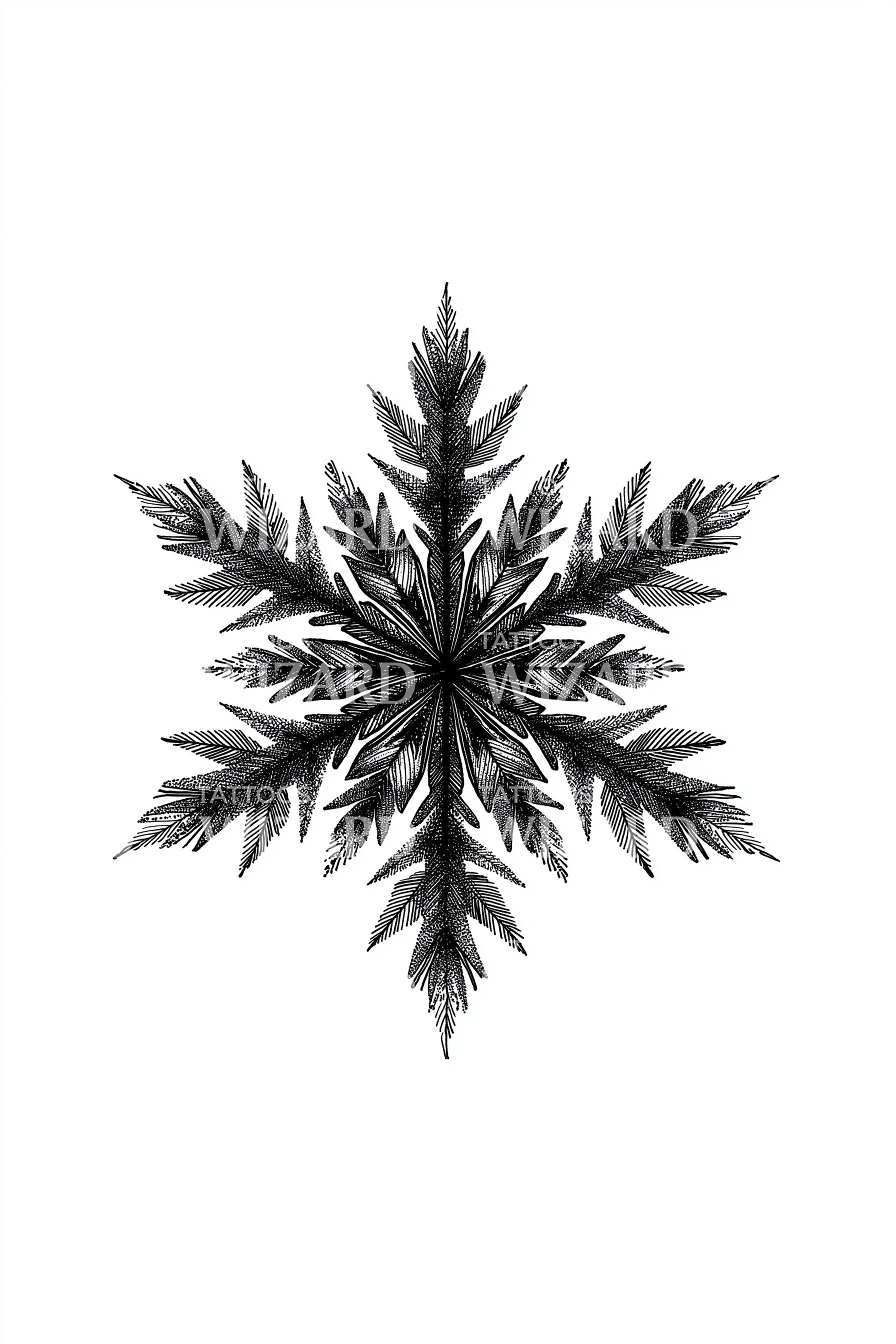 Blackwork snowflake woven from leaflike fronds, rendered in crisp linework and stippled shadows, forms an organic mandala. Symbol of winter’s quiet resilience and nature’s renewal, it honors uniqueness and growth in stillness. Worn on skin, it brings cool clarity, grounded calm, and a breath of evergreen wonder.