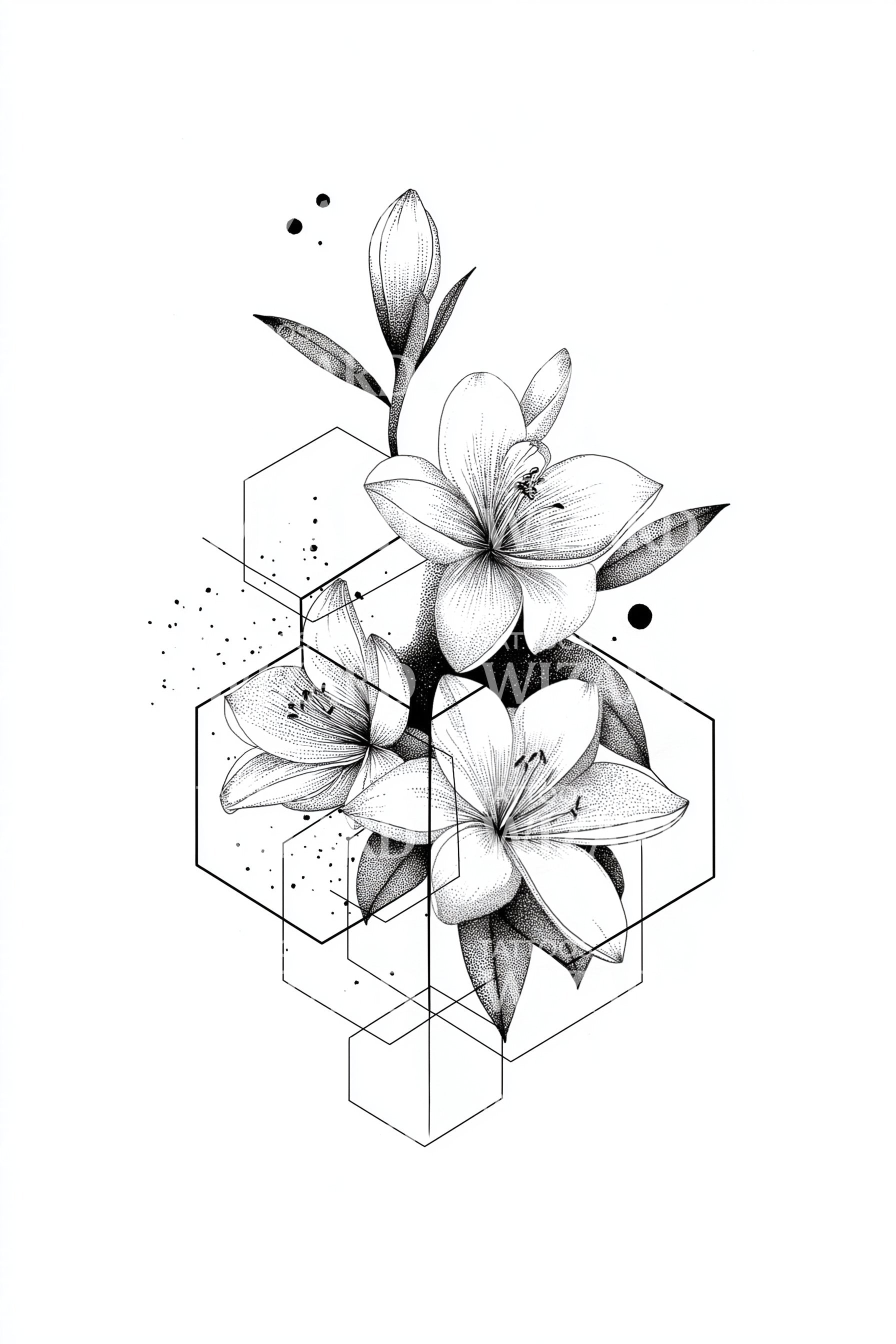 Immergiti nel mondo della geometria con questo straordinario disegno per tatuaggi. Mostrando un bouquet di magnolie delicatamente inciso in un sofisticato cubo, questo design geometrico offre un'unica fusione di natura e figure, perfetto per chi cerca eleganza intrecciata con precisione matematica. Aggiungi oggi un tocco di carattere alla tua tela.