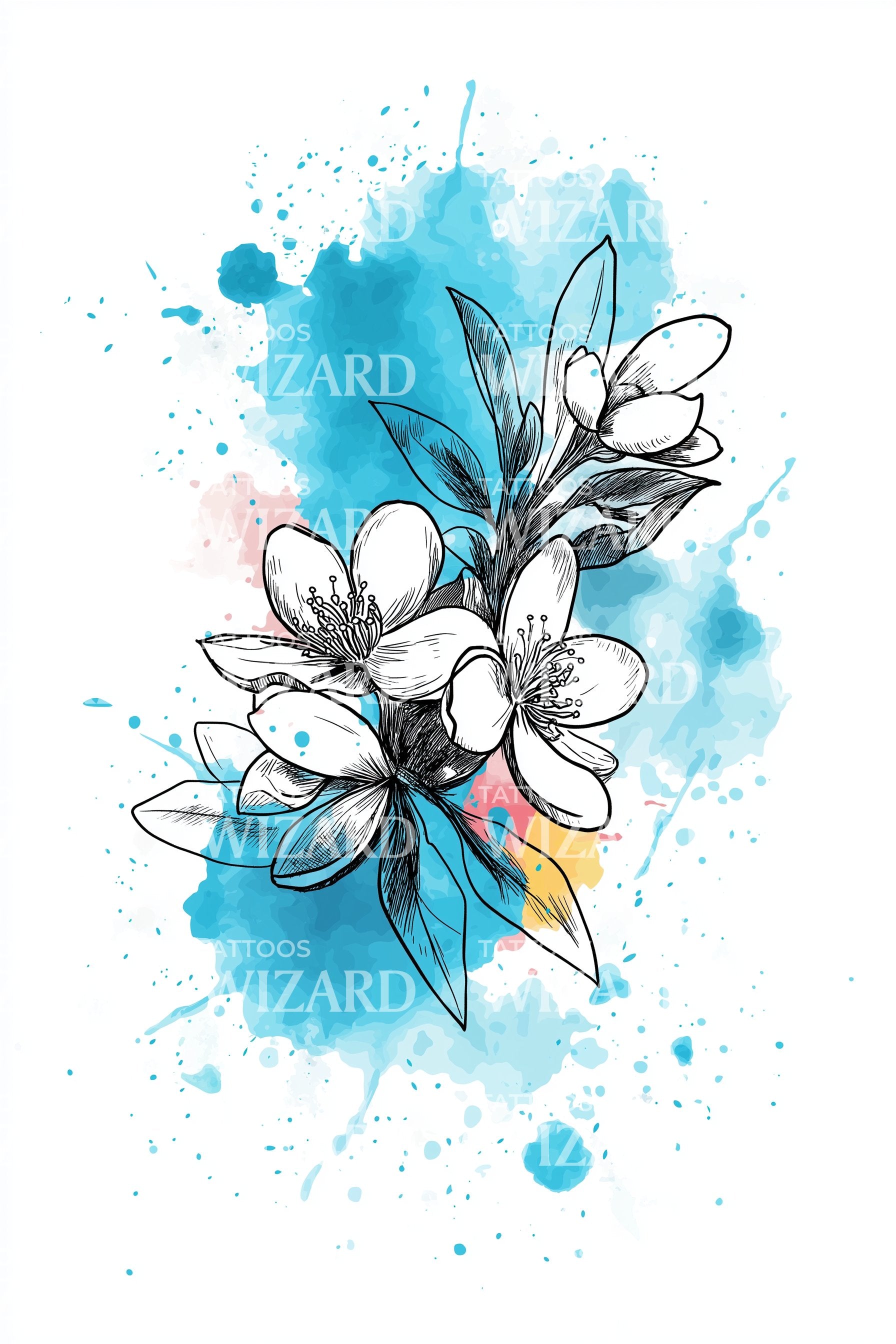 Abbraccia la serenità della natura con questo delicato disegno di tatuaggio ad acquerello. Presenta un ramo di magnolia squisito, dipinto in morbide tonalità di turchese. La tecnica unica dello spruzzo dà vita ai petali, catturandone la fragilità. Questo pezzo evoca un'atmosfera tranquilla, perfetta per chi cerca una bellezza eterea.