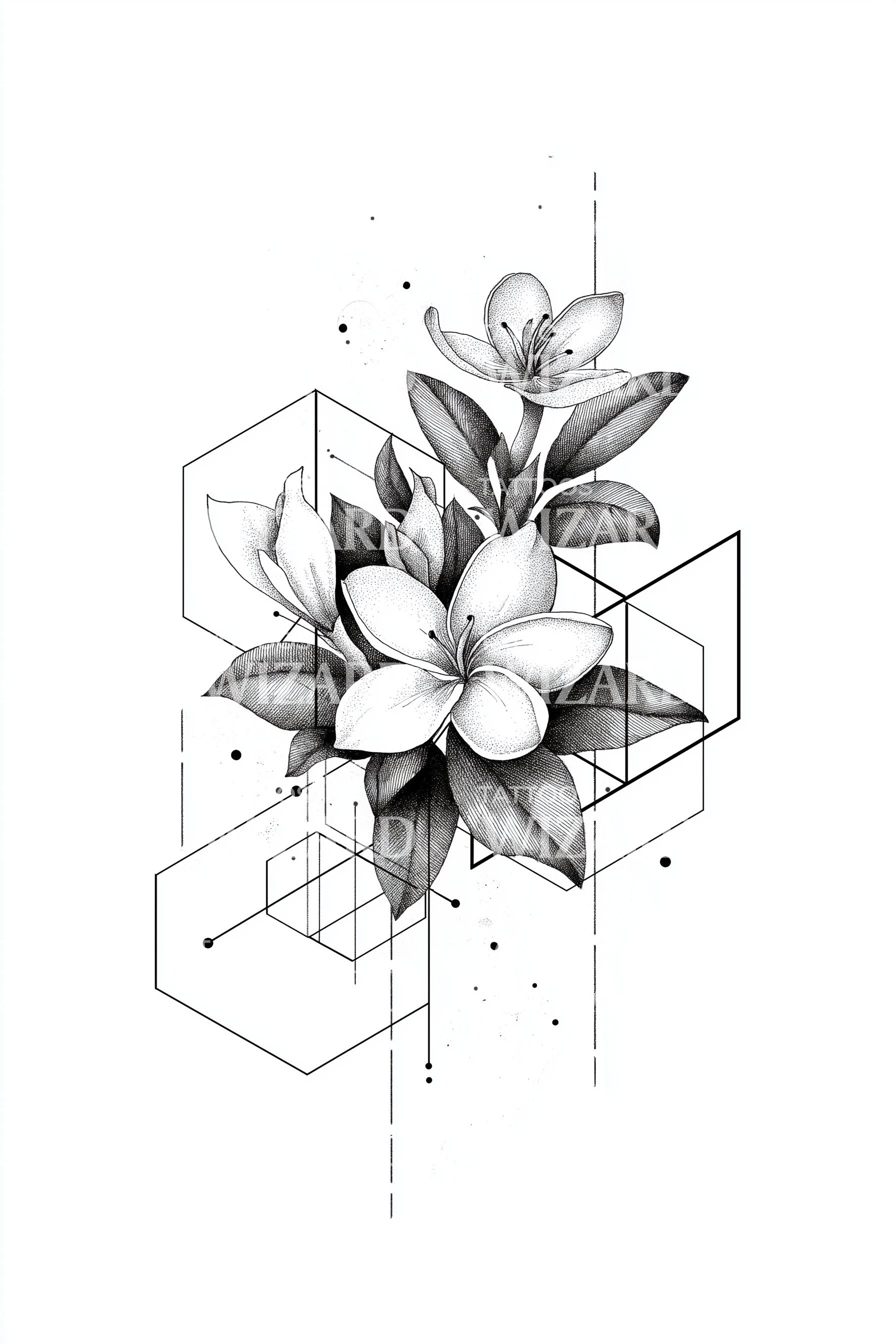 Immergiti nel mondo dell'arte d'avanguardia con il nostro straordinario disegno di tatuaggio floreale. Combina sapientemente l'eleganza dei fiori di magnolia con una struttura a cubo dimensionale all'avanguardia. Una scelta perfetta per chi celebra la propria unicità e adora un'interpretazione straordinaria dell'estetica floreale.