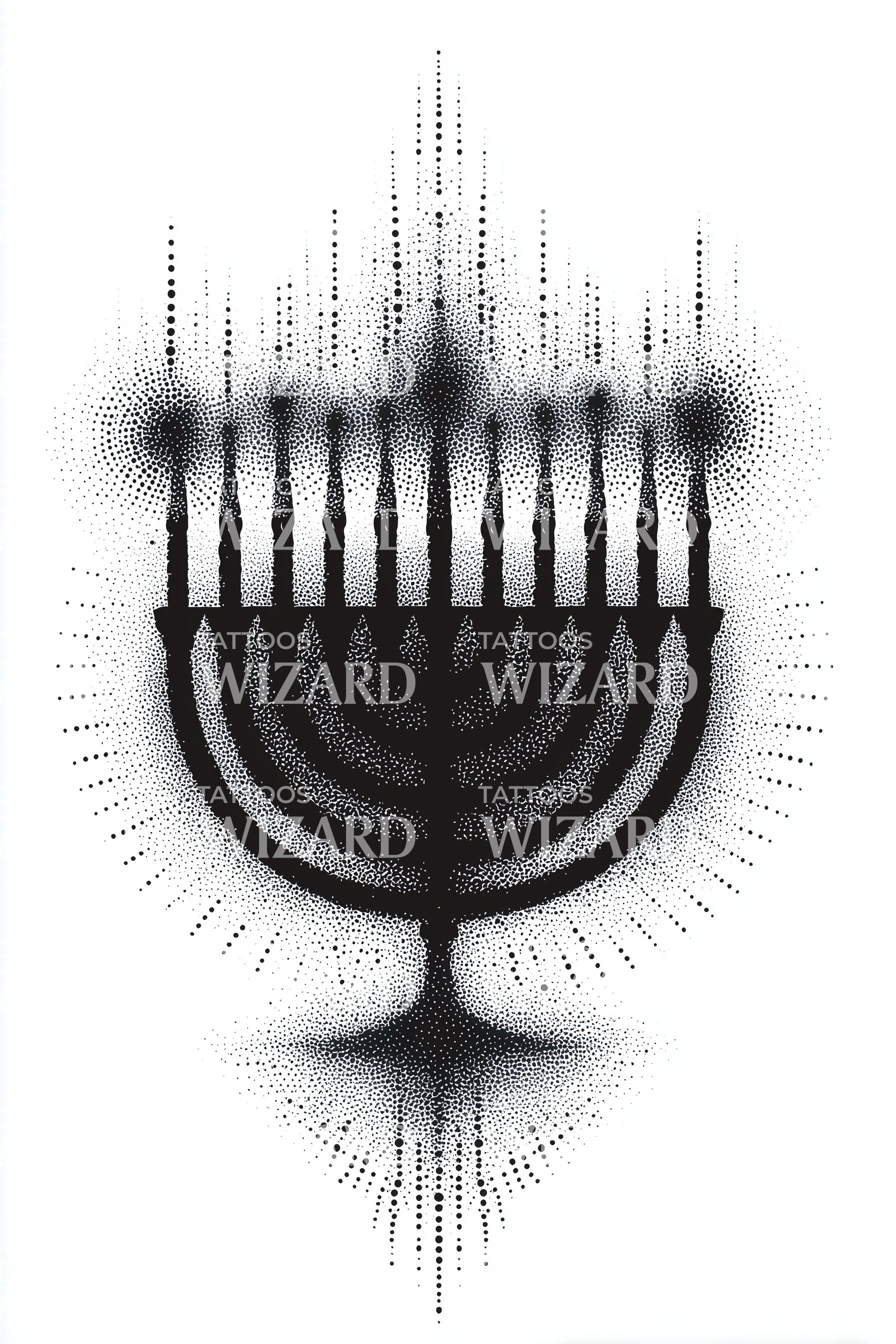 Questo eccezionale disegno di tatuaggio dotwork incarna magnificamente la sacra tradizione della fede ebraica. Presentando una Menorah finemente dettagliata, simboleggia la luce eterna e la fede incrollabile. Questo pezzo irradia davvero un profondo senso di riverenza, colmando il divario tra fede divina e arte corporea.