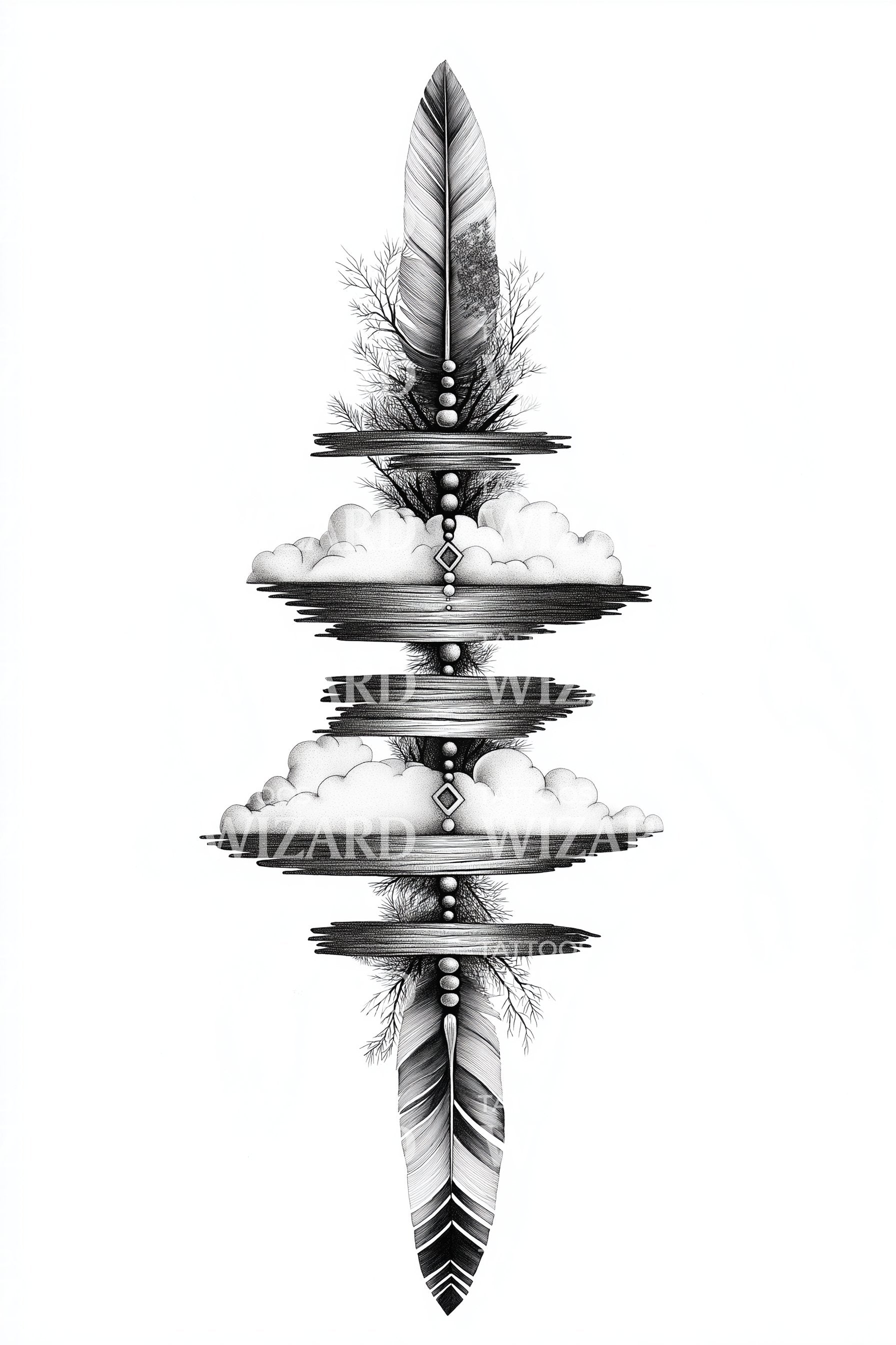 Sketched horizons mirror along a feathered totem, clouds and grainy lines stacked in serene symmetry. The feather speaks of guidance and lightness, while reflections suggest inner balance and ancestral echo. Worn on skin, the abstract column feels grounding yet uplifting, a quiet compass between earth and sky always.