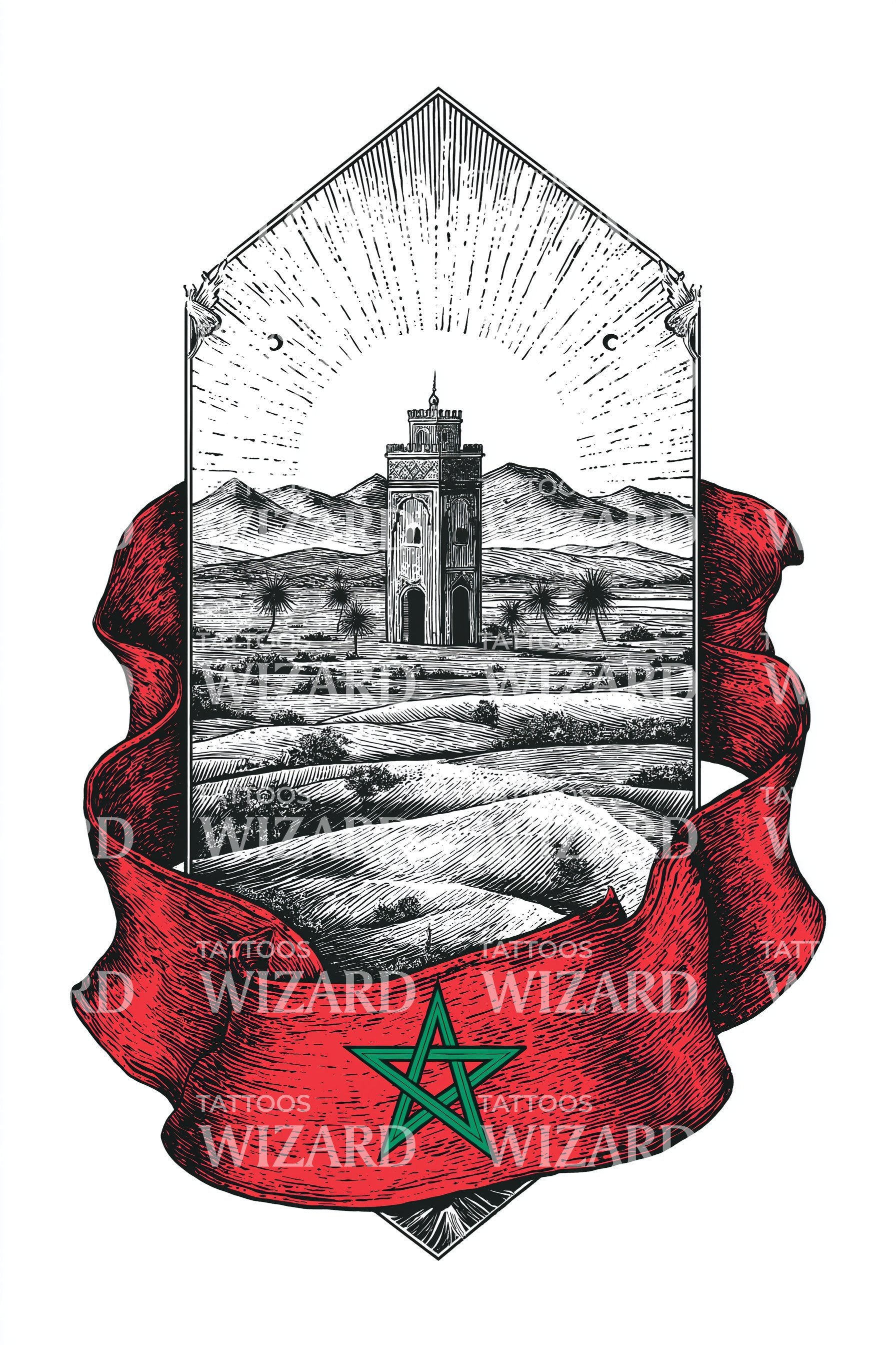 Evochando il Marocco con un meticoloso dotwork, questo tatuaggio paesaggistico incornicia una kasbah sotto le aspre montagne dell'Atlante. Un fine puntinismo costruisce profondità e foschia desertica, mentre un nastro sinuoso si dispiega in una bandiera stilizzata, aggiungendo movimento e significato. Simbolismo senza tempo, ricco di viaggi, per esploratori, narratori e amanti del fascino nordafricano.