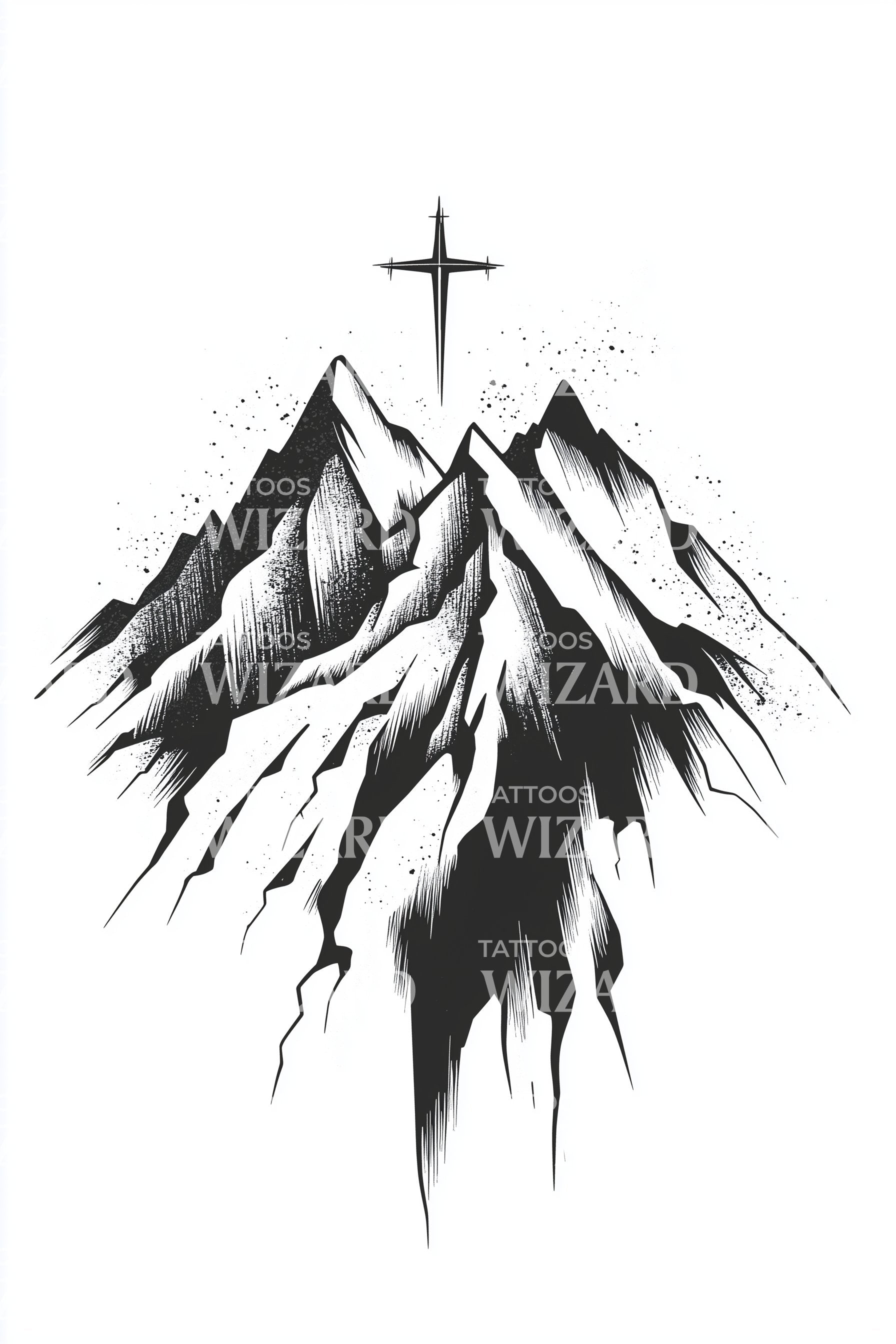 Svela il potente simbolismo della fede e della resilienza con questo tatuaggio blackwork finemente dettagliato. Ti trasporta alla vetta di una montagna adornata da una croce, racchiudendo l'ascendenza spirituale e la perseveranza, rendendolo una scelta ideale per chi necessita di forza contro le molte sfide della vita.