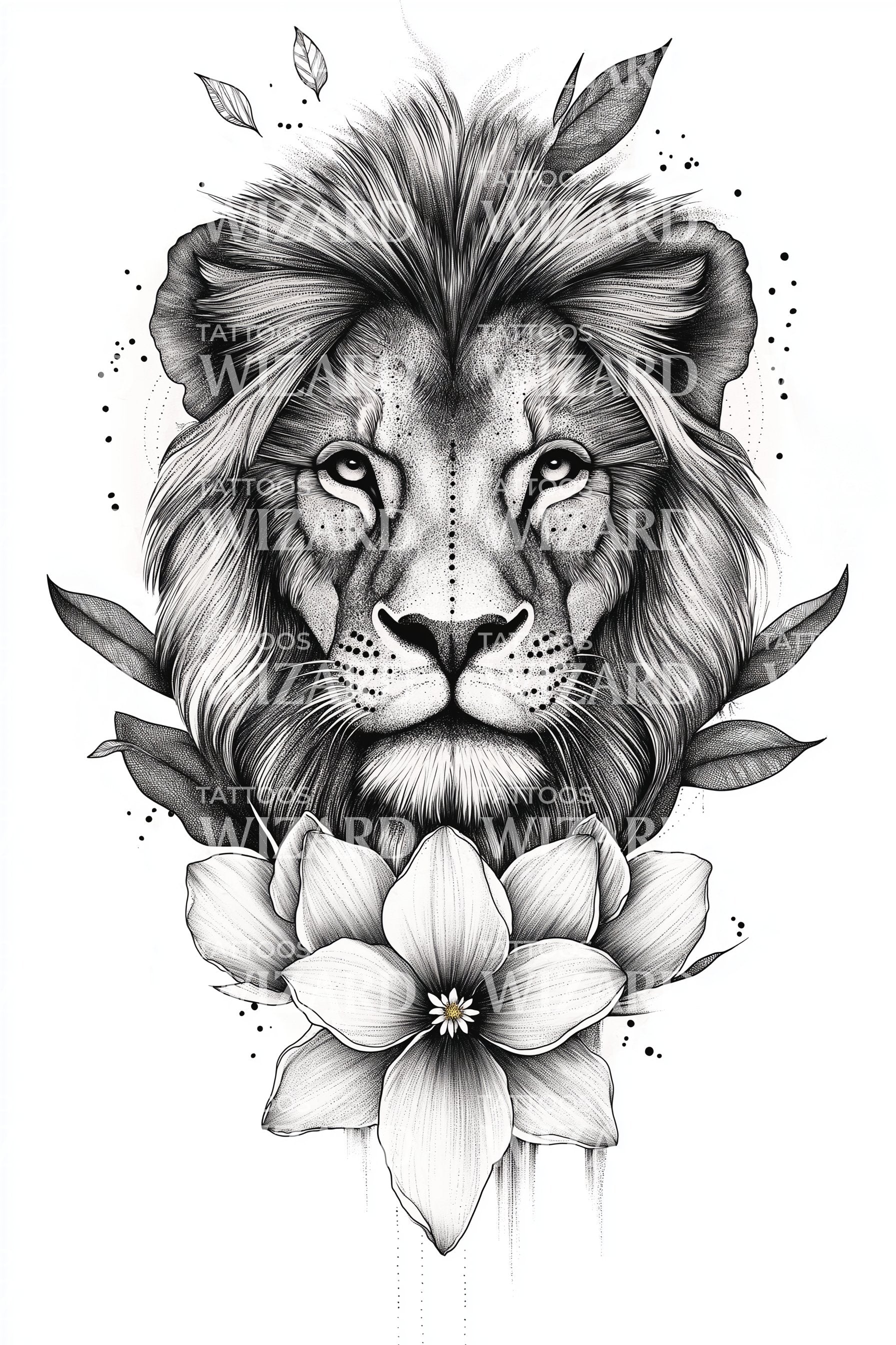 Vivi un emblema di potere e grazia con questo disegno di tatuaggio in bianco e nero. Presenta un ritratto regale di un leone, intrecciato con naturalezza a un simbolico fiore di loto. Questa maestosa rappresentazione animale promette di valorizzare la tua persona con fascino estetico e vigore spirituale.