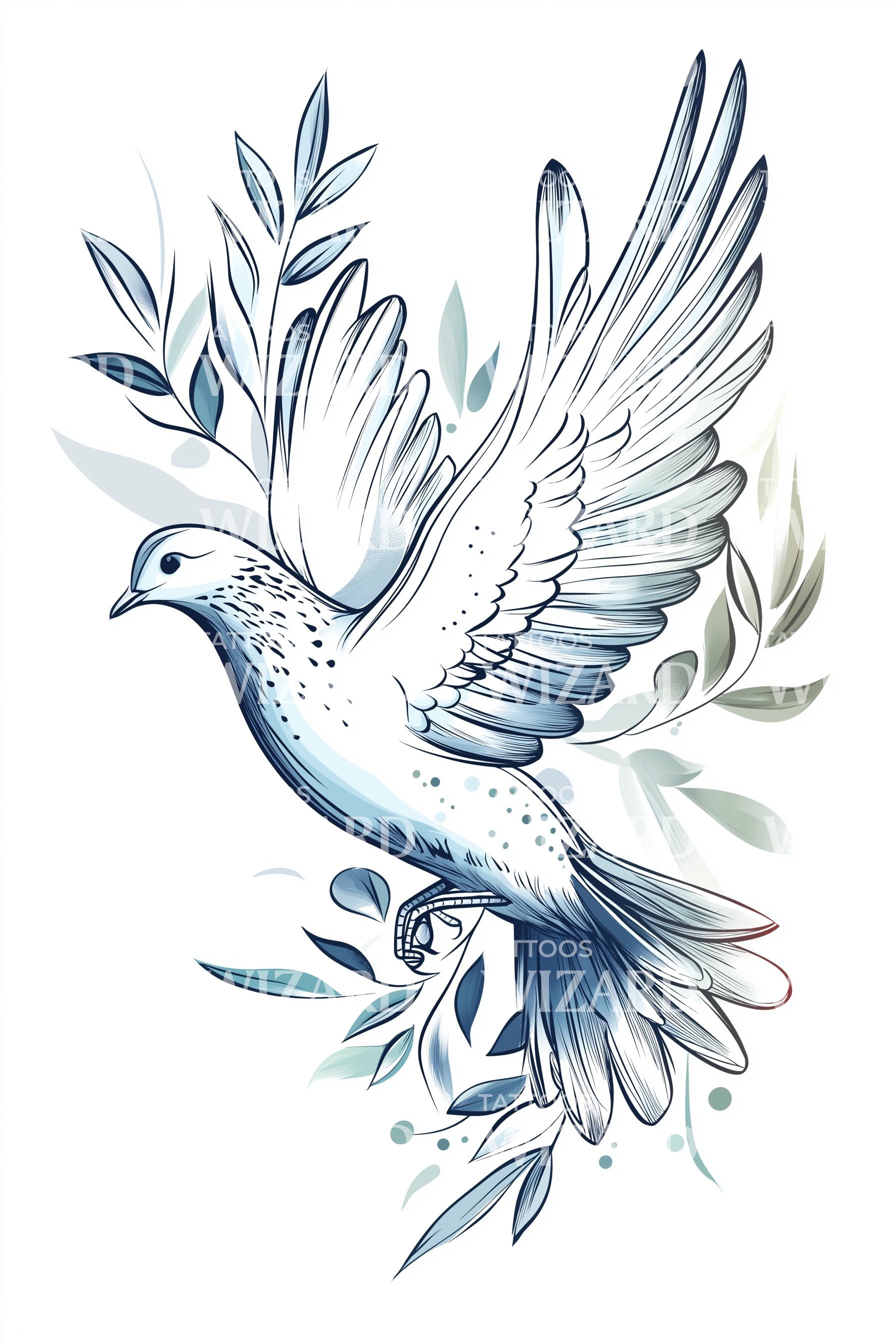 Immergiti nella serenit\u00e0 con questo disegno di tatuaggio illustrativo. Rappresenta una colomba pacifica, che stringe un ramo d'olivo verdeggiante in tonalit\u00e0 di blu tranquillo. Simbolo di fede e pace, questo disegno delicato ma audace incarna in modo intricato un messaggio senza tempo di speranza. Aggiungi tranquillit\u00e0 alle tue scelte di tatuaggi con questo simbolo di armonia.