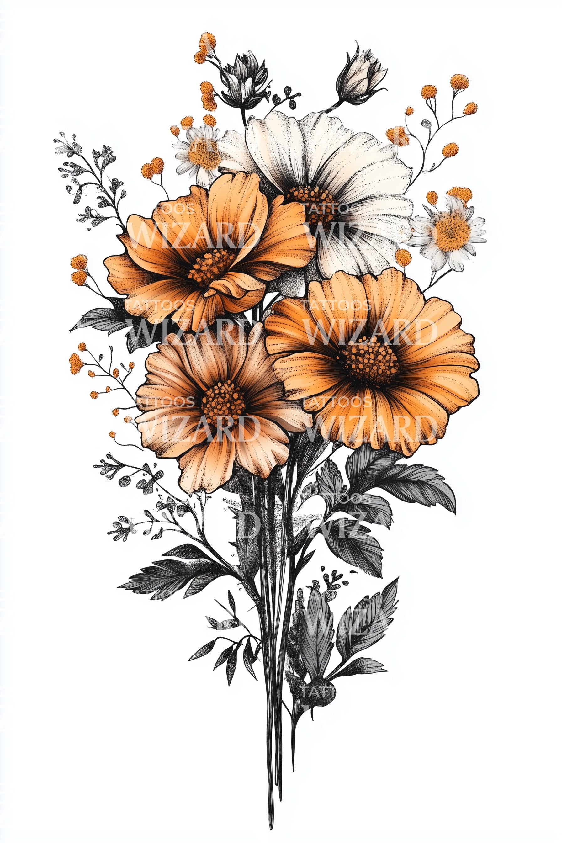 Immergiti nella bellezza della natura con questo vibrante disegno di tatuaggio Neotradizionale. Realizzato con un tocco vintage, presenta un bouquet illustrativo di fiori arancioni, che emana un senso di nostalgia. Questa opera d'arte permanente unica unisce perfettamente tradizione e modernità, rendendola un'aggiunta straordinaria alla tua tela corporea.