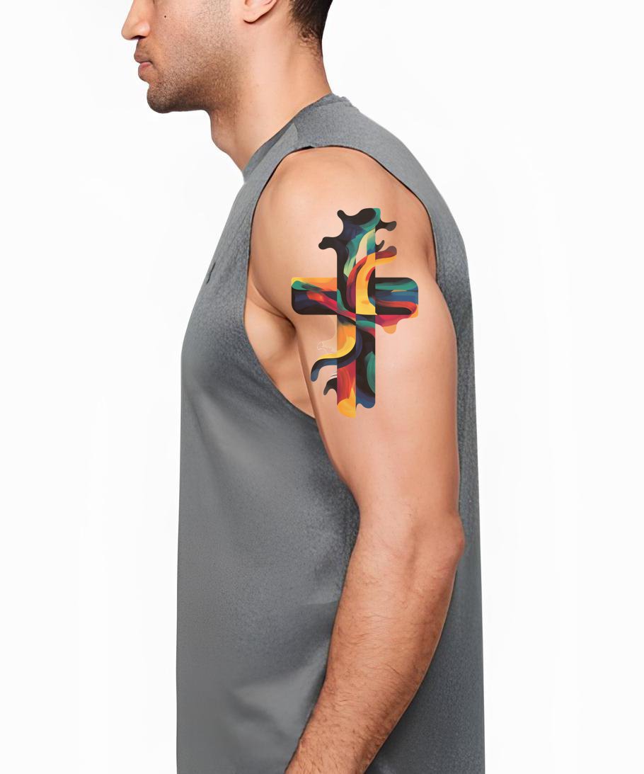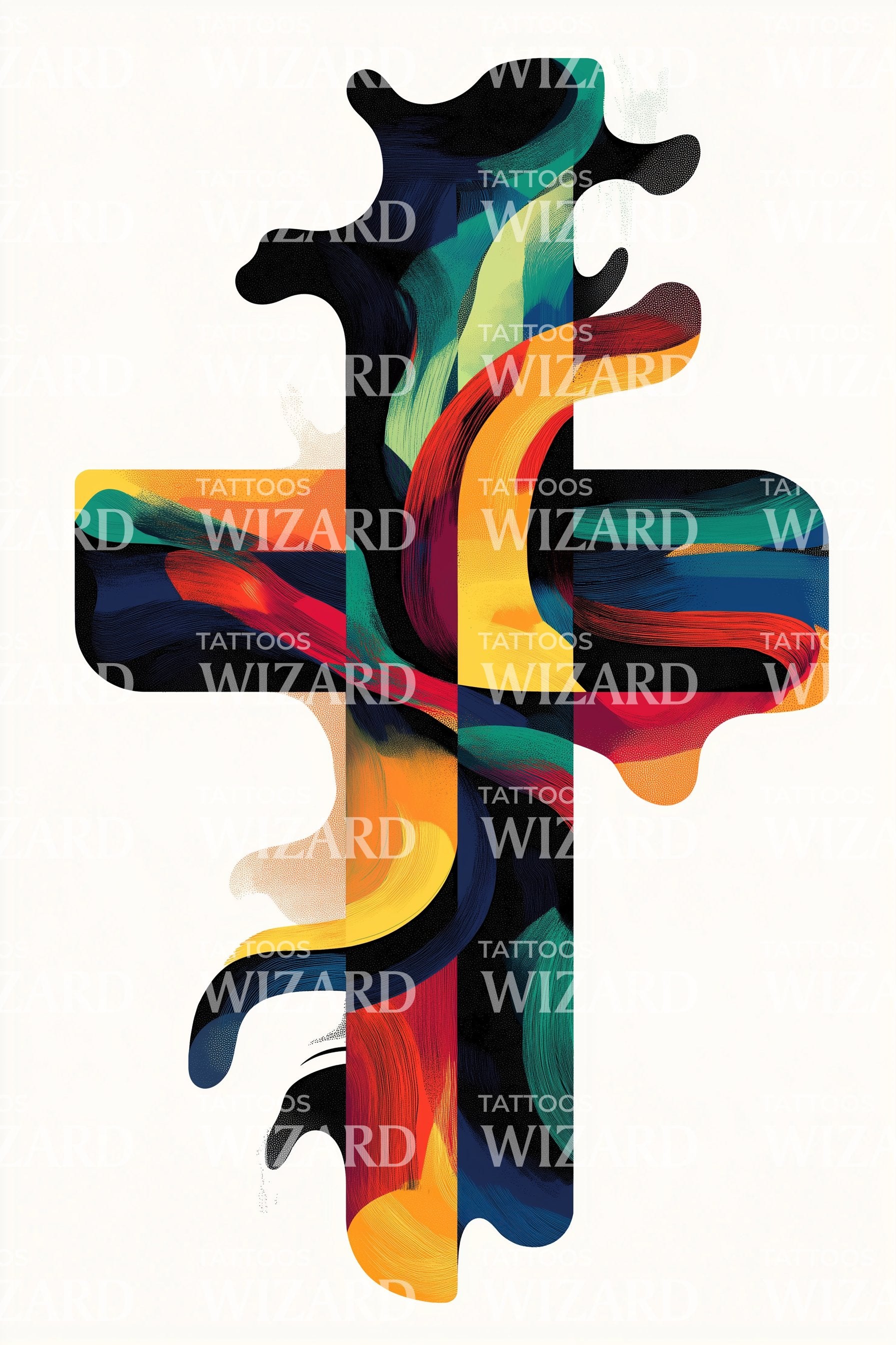 Incarna audacemente la tua fede con questo design di tatuaggio newschool. Presenta una croce vibrante, artisticamente realizzata in una fusione di multicolori, incorniciata da dinamiche schizzi di vernice. Un'illustrazione vivida della fede, il design è sia una dichiarazione personale che un'opera d'arte da indossare. Scatena la vivacità sulla tua pelle con questo design unico.