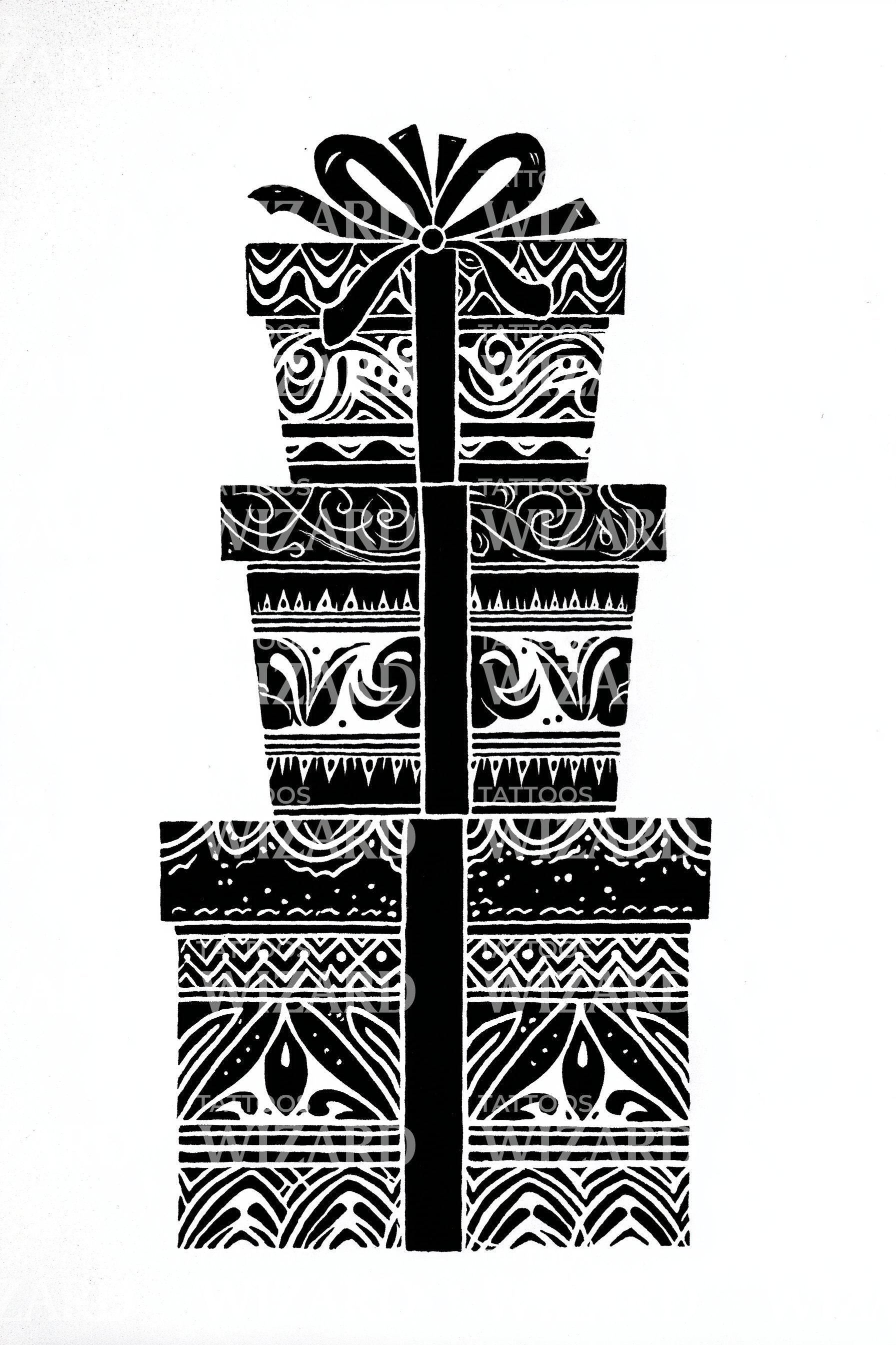 Stacked presents rise in ornamental blackwork, tied with a ribbon and crowned by a bow. Each box carries tribal patterns, swirling waves and leafed motifs, a tapestry of tradition and generosity. Symbols of layered blessings, they embody abundance and gratitude, gifting the wearer holiday spirit and serene joy.