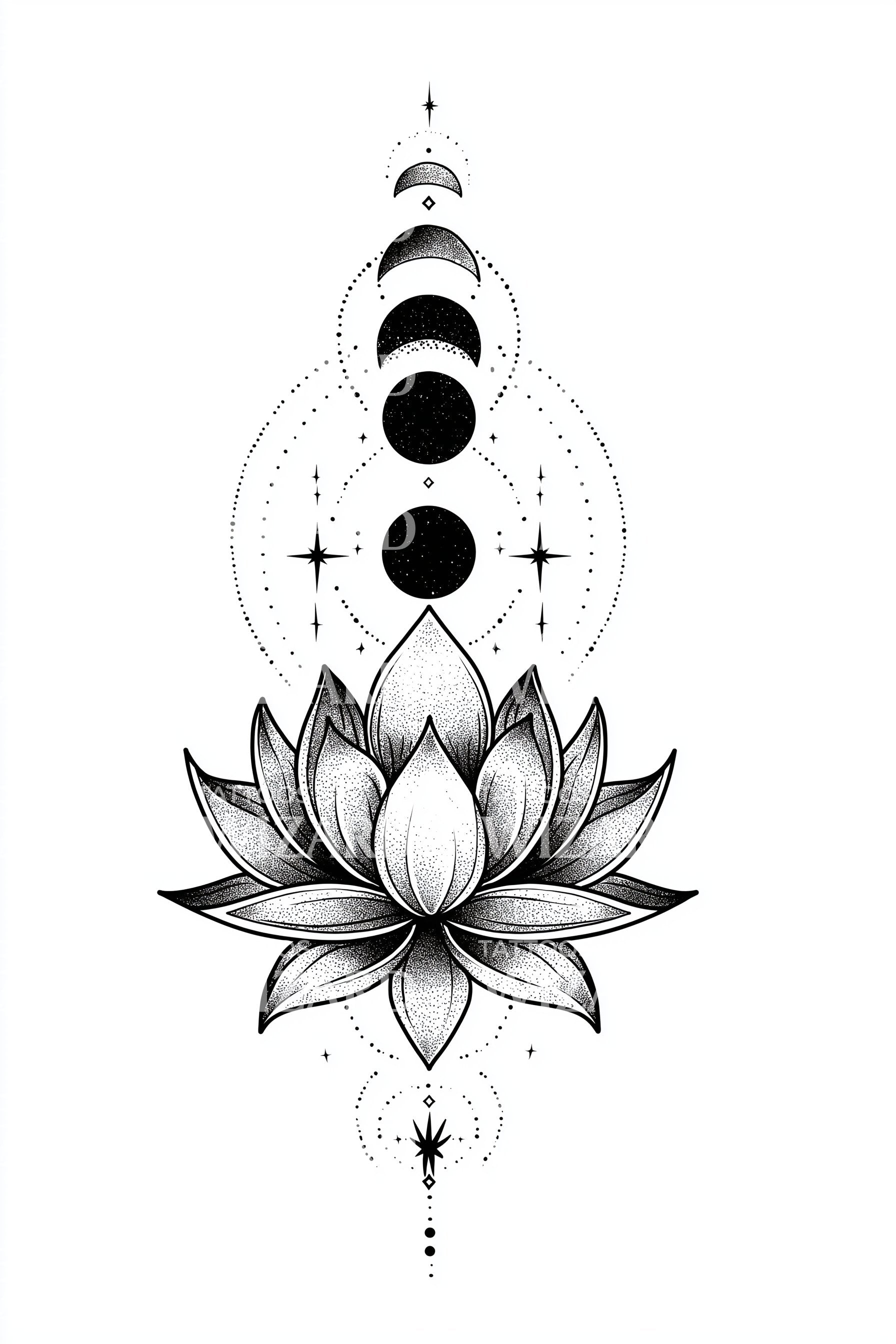Svela la tua connessione cosmica con questo straordinario disegno di tatuaggio geometrico. Disegnato con cura, presenta un tema astrale stellare, incorporando le fasi della luna avvolte da un loto splendidamente disegnato. Un emblema perfetto di evoluzione e crescita spirituale, che risuona con l'energia lunare e la geometria divina.