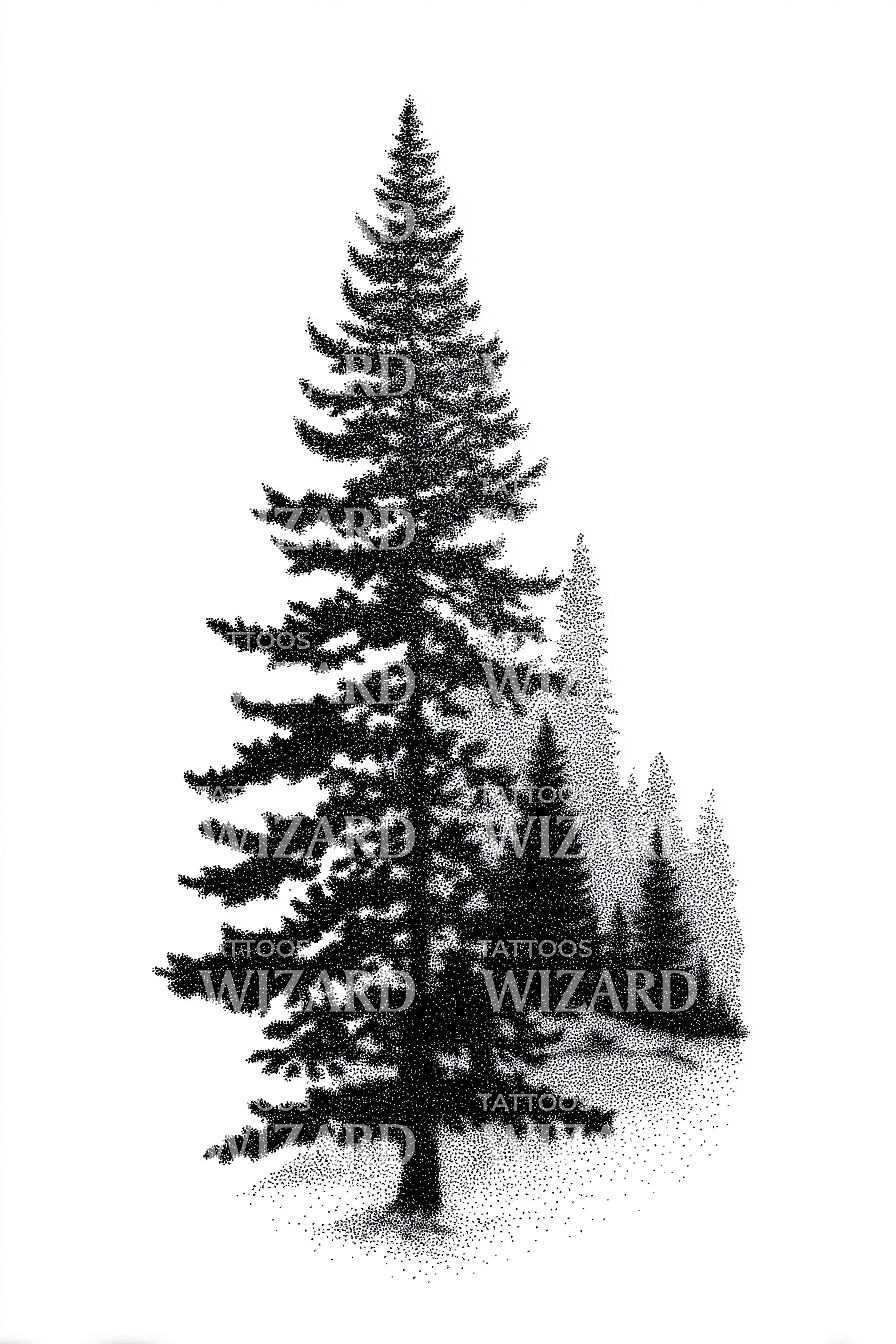 Stippled blackwork pine rises in bold silhouette, foregrounded against a misted forest fading to gentle dots. Rooted strength meets quiet wilderness, symbolizing resilience, renewal, and the pull of wild horizons. Wearing it feels grounded yet free, a steady breath of evergreen calm guiding every step through life's seasons.