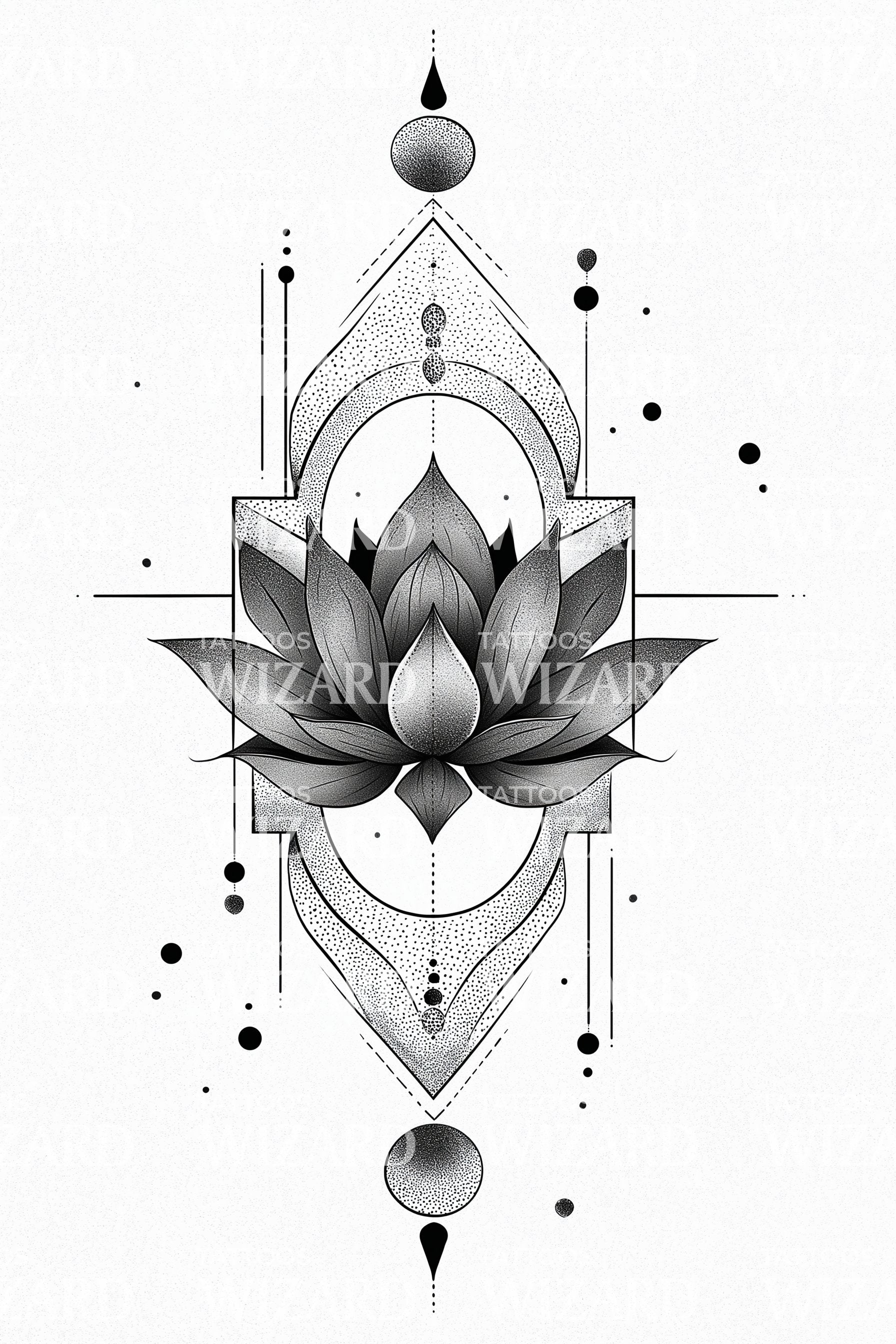 Questo moderno disegno di tatuaggio geometrico sfuma la linea tra astratto e concreto. La combinazione di un loto e un prisma irradia un'aura unica, rendendo il pezzo allo stesso tempo equilibrato e dinamico. La sua intricata angolarità conferisce un tocco sofisticato a una versione modificata e accattivante di un simbolo amato.