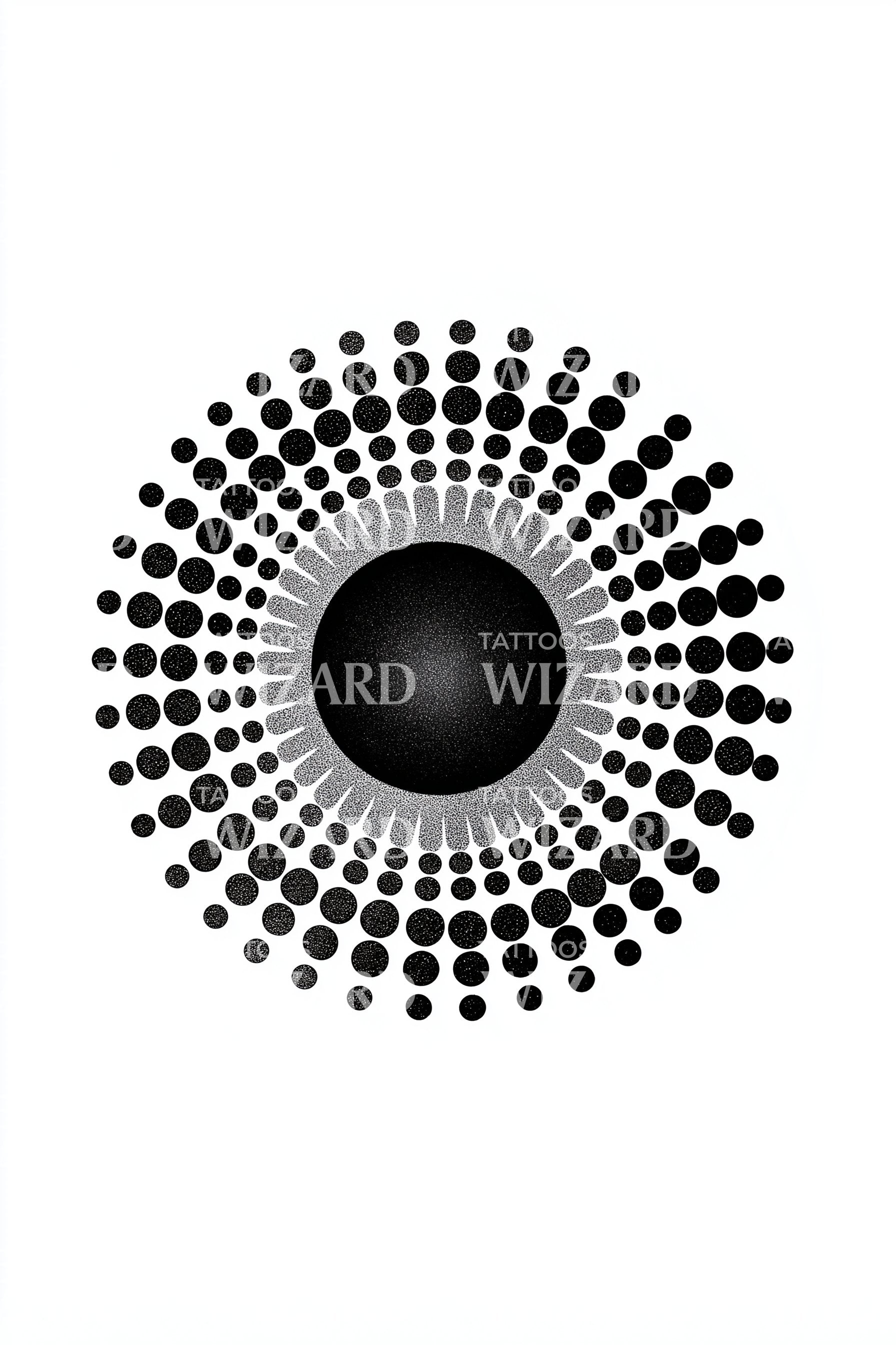 Intricato e radiante, questo disegno tatuaggio dotwork crea impeccabilmente un potente senso di energia. Realizzato con maestria utilizzando contrasti coinvolgenti, il design sfrutta una combinazione sorprendente di sfera e cerchio. I dettagli elaborati a punti ne esaltano l'appeal ipnotico, promettendo un'esperienza di body art affascinante.