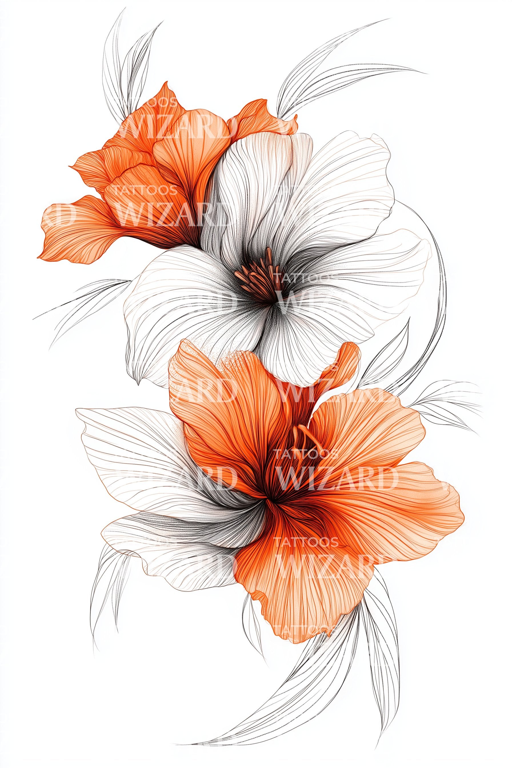 Immergiti nel mondo dell'arte interpretativa con questo disegno di tatuaggio illustrativo. Presentando vivaci tonalità di arancione, sfoggia un coinvolgente motivo a vortice. Il design è finemente intrecciato con eleganti motivi floreali ed elementi simili a nastri, incarnando un'unica fusione di eleganza e audacia audace.