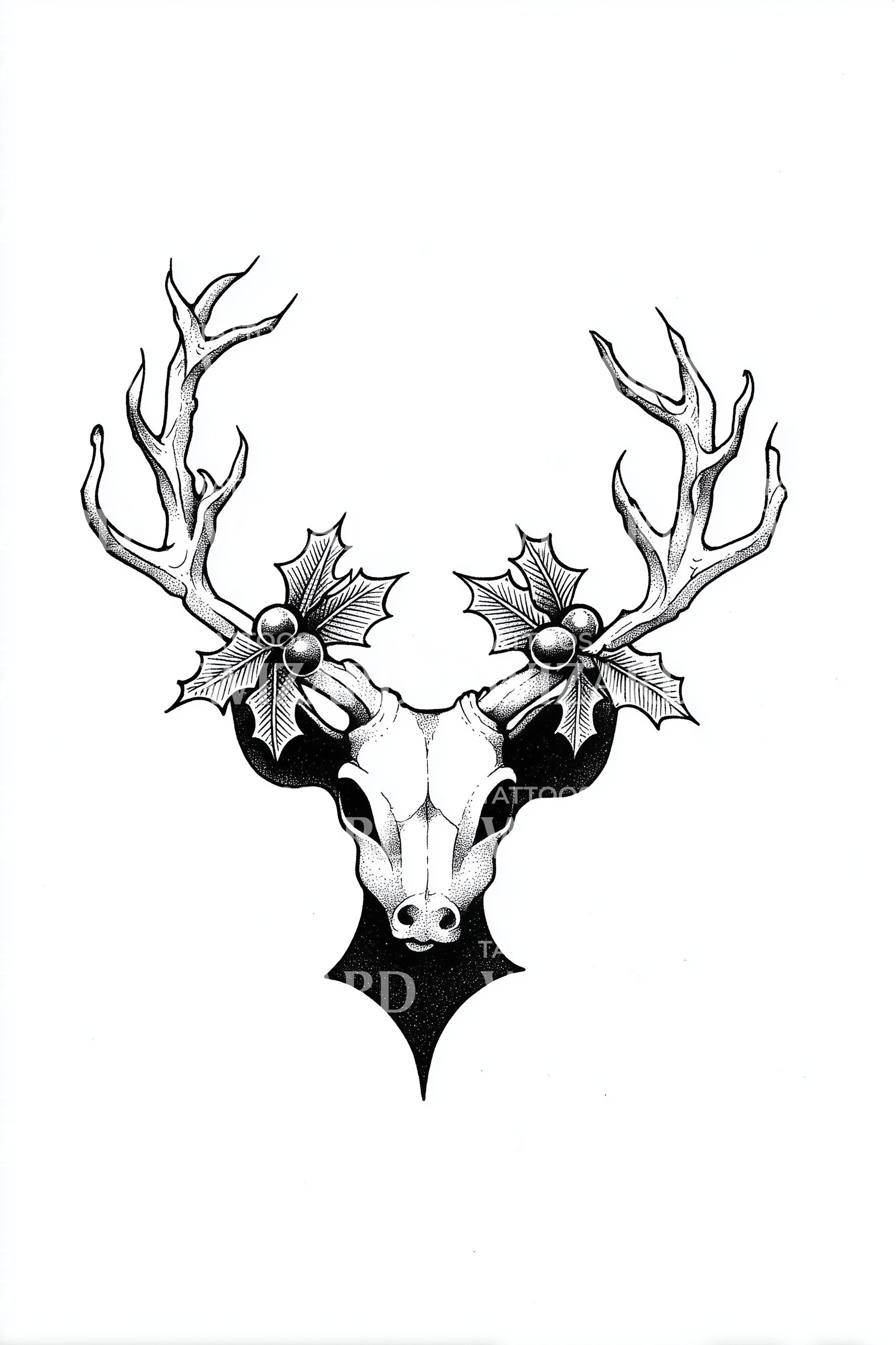 Blackwork stag skull with stark, stippled shadows; branching antlers cradle winter holly and berries, centered in ritual symmetry. Symbol of cycles, the horned guardian bridges life and death, wilderness and yuletide. Wearing it feels fierce and sacred, a calm occult beacon of resilience through dark seasons.