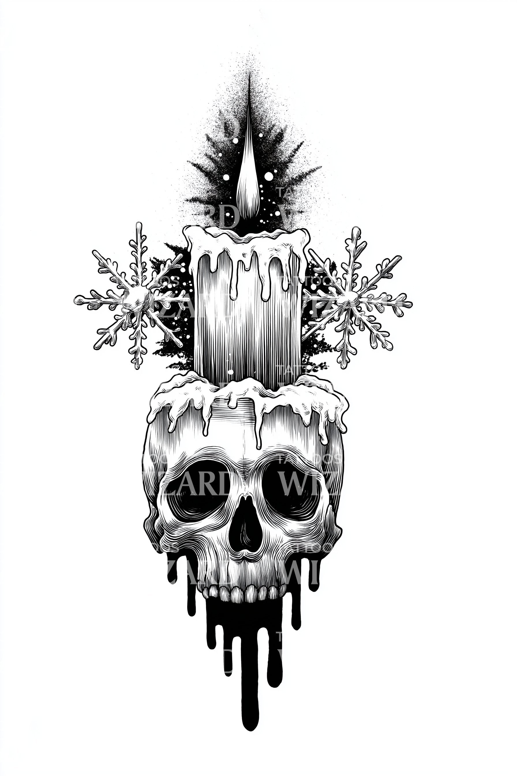 Blackwork realism renders a wax-laden candle crowning a skull, flanked by crystalline snowflakes, like a winter altar. The flame honors mortality while kindling rebirth, a christmas solstice ritual of light over shadow. Worn, this piece brings grounded calm, gothic poise, and fierce remembrance of cycles and eternal return.