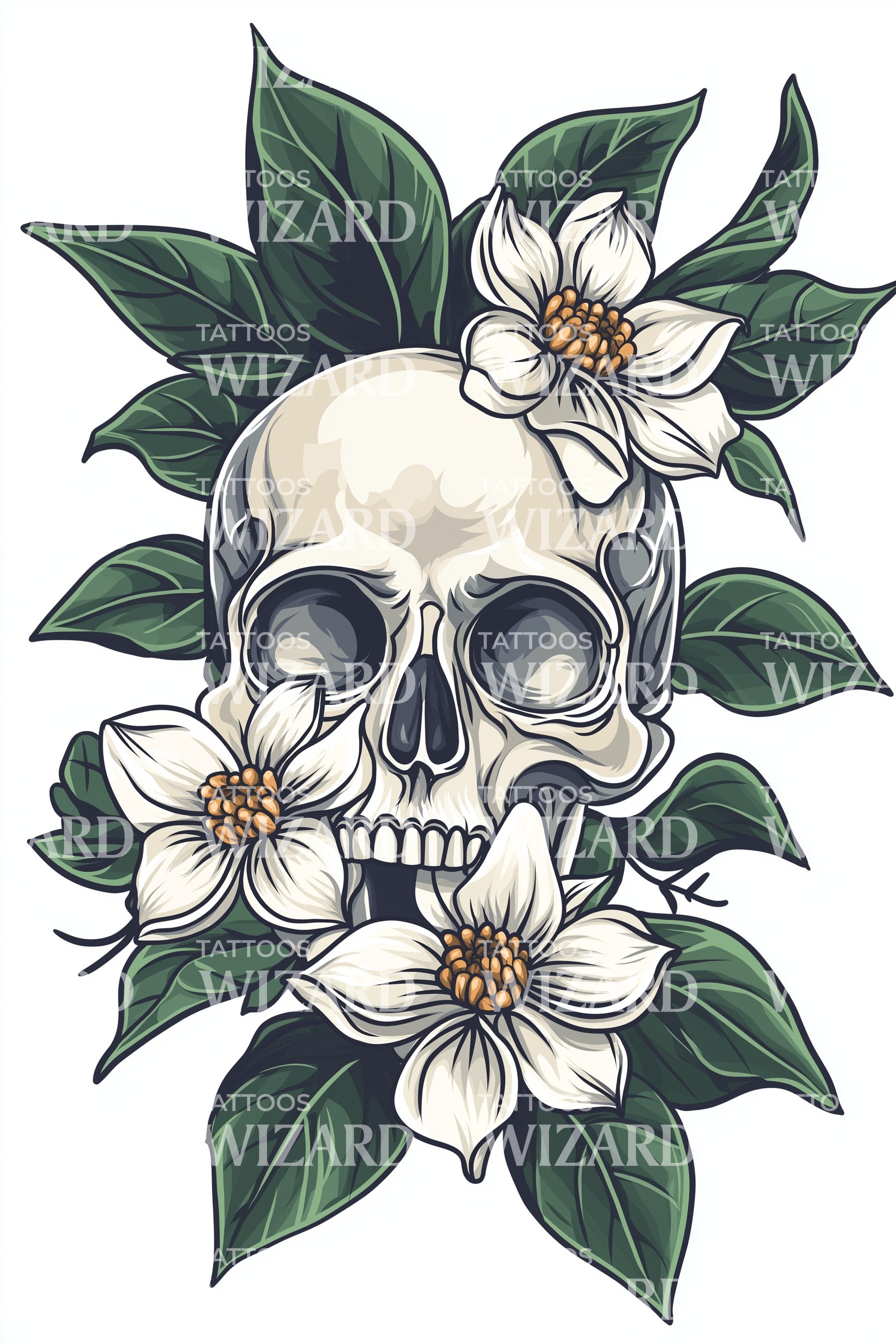 Vivi la perfetta fusione di mistero e bellezza con il nostro design di tatuaggio neotradizionale che presenta un teschio mozzafiato avvolto da colorati fiori di magnolia. Un ricordo toccante, questo design incarna una fusione unica di immagini di vita e morte, racchiusa nello stile neotradizionale d'impatto.