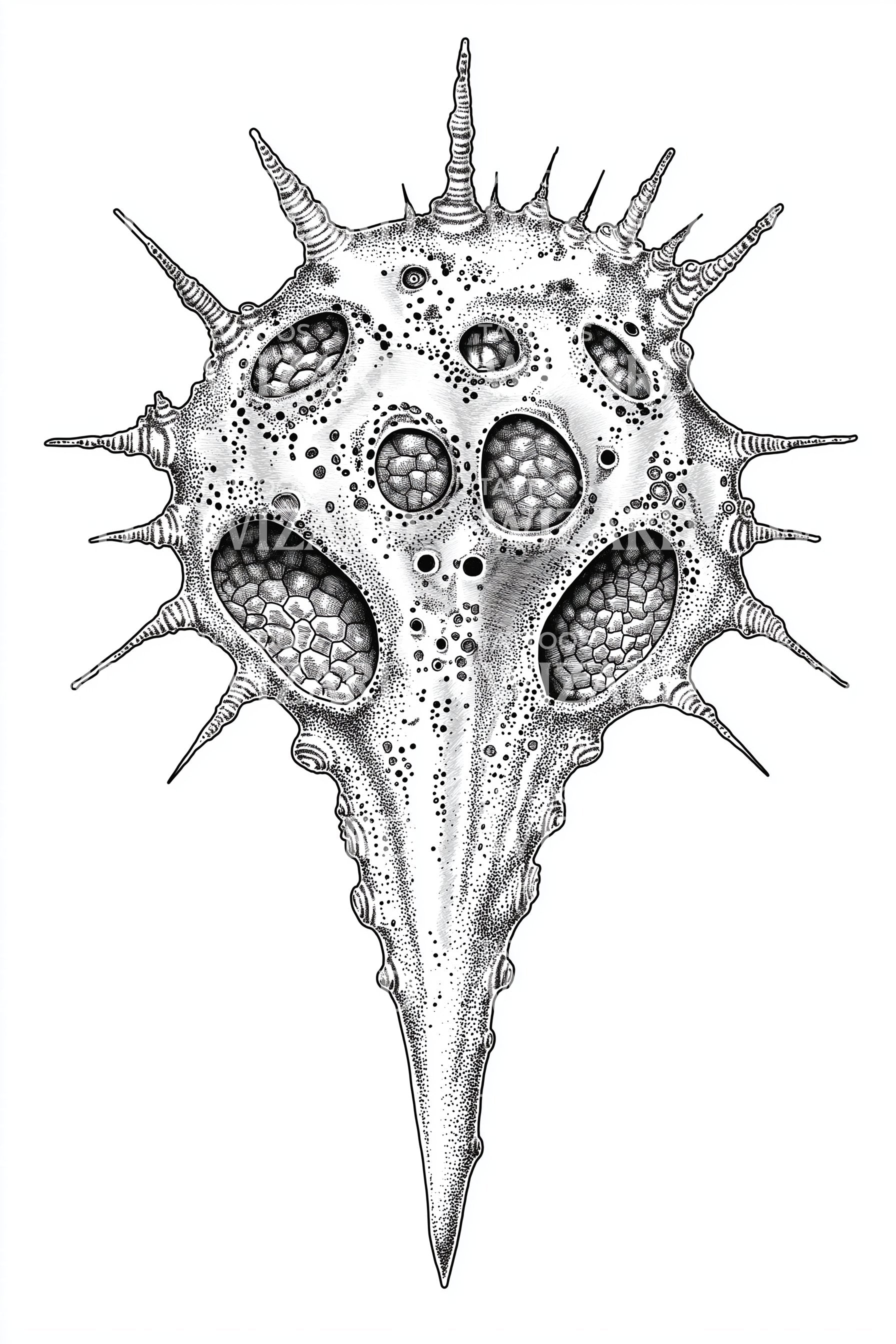 Radiolarian skull mask, alien in its silence, speaks for the ones who never fit the easy story. Dotwork turns fear into constellation, grief into armor, curiosity into a vow. You claim the truth that survival can be strange and still holy. “Let the void teach you new teeth.”