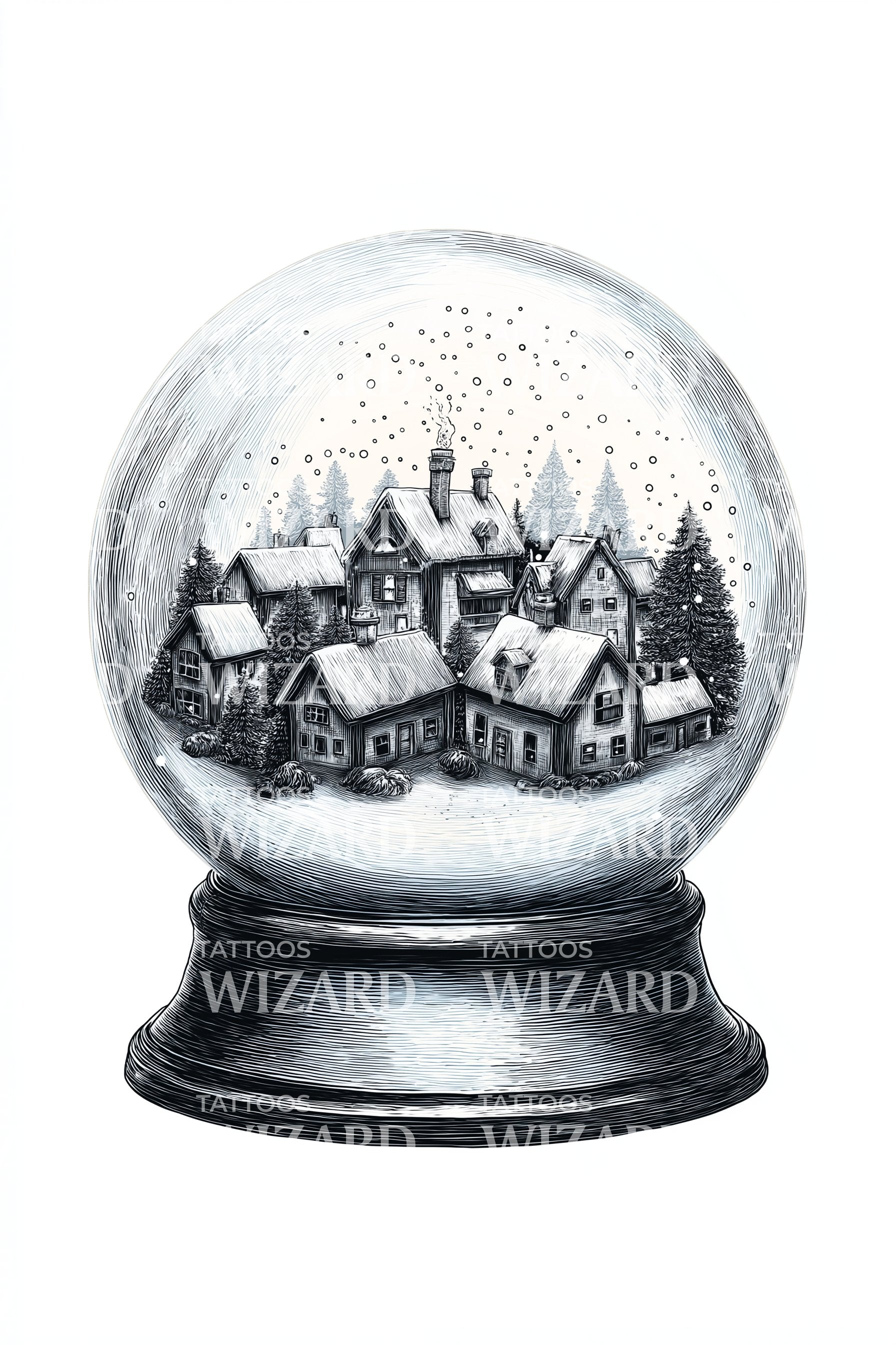 Black&grey linework forms a crystal snowglobe, a winter panorama of timbered cottages, firs, and soft swirling snow. The village symbolizes belonging, memory, and shelter through cold seasons, a pocket of holiday light. Wearing it feels like carrying home, quiet, protective, nostalgic, inviting warm hearth and evergreen hope.
